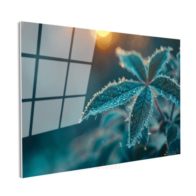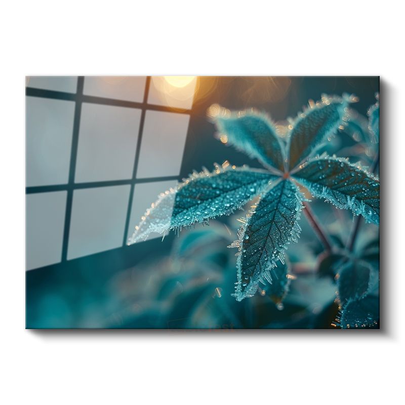 Çiy Damlalı Yaprak - Turkuaz Tonlarda Makro Çekim Cam Tablo
