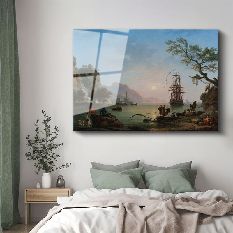 Claude-Joseph Vernet - Sakin Limanda Günbatımı Cam Tablo