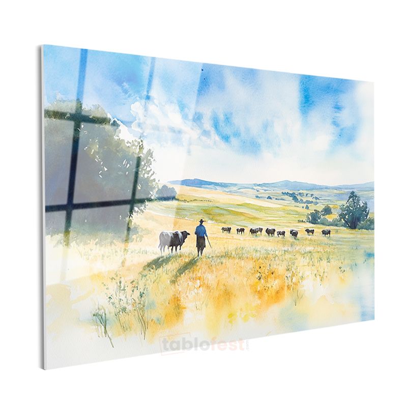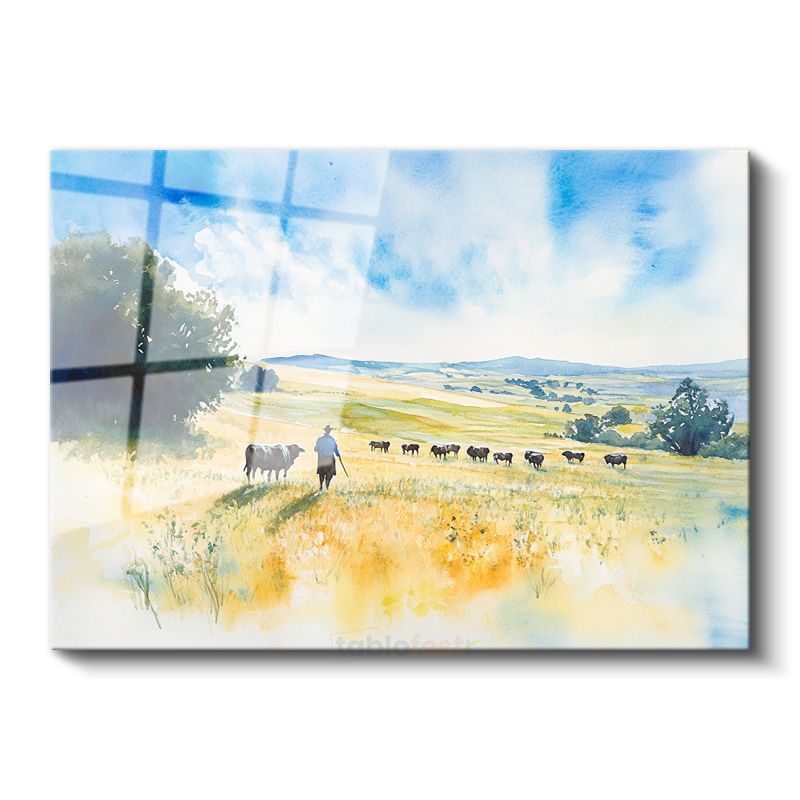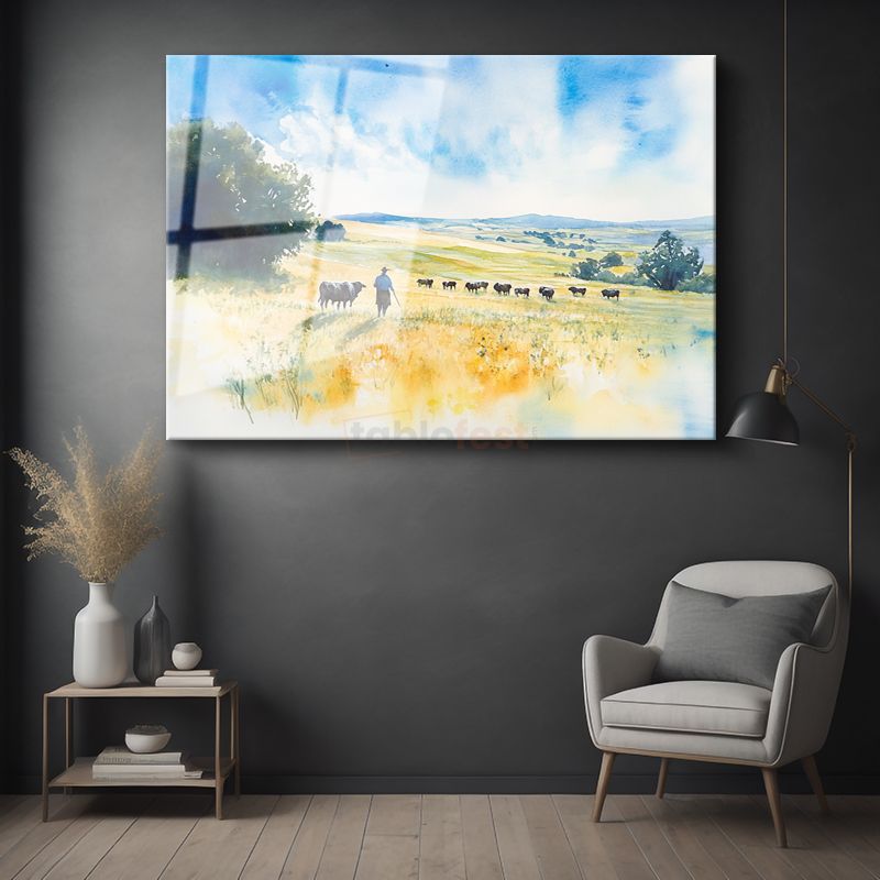 Çoban ve Sürüsü - Altın Sarısı Buğday Tarlasında Huzurlu Anlar Cam Tablo