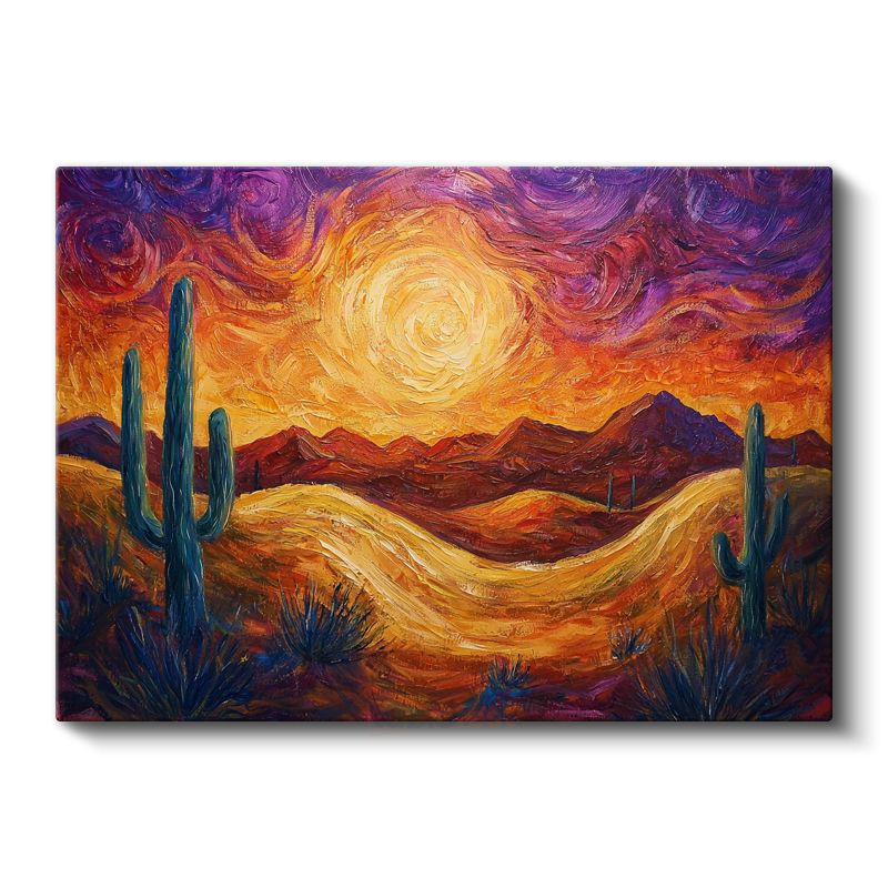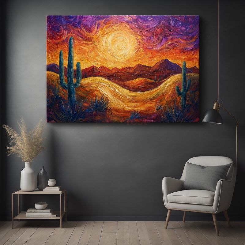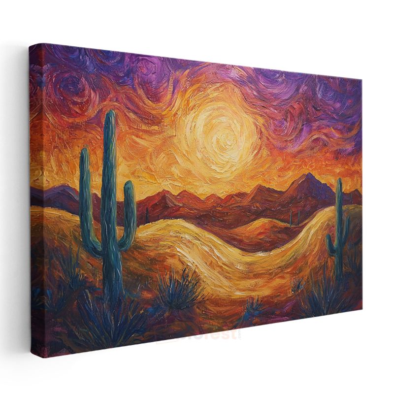 Çöl Günbatımı - Kaktüsler ve Dağlar Arasında Alev Renkli Gökyüzü Kanvas Tablo