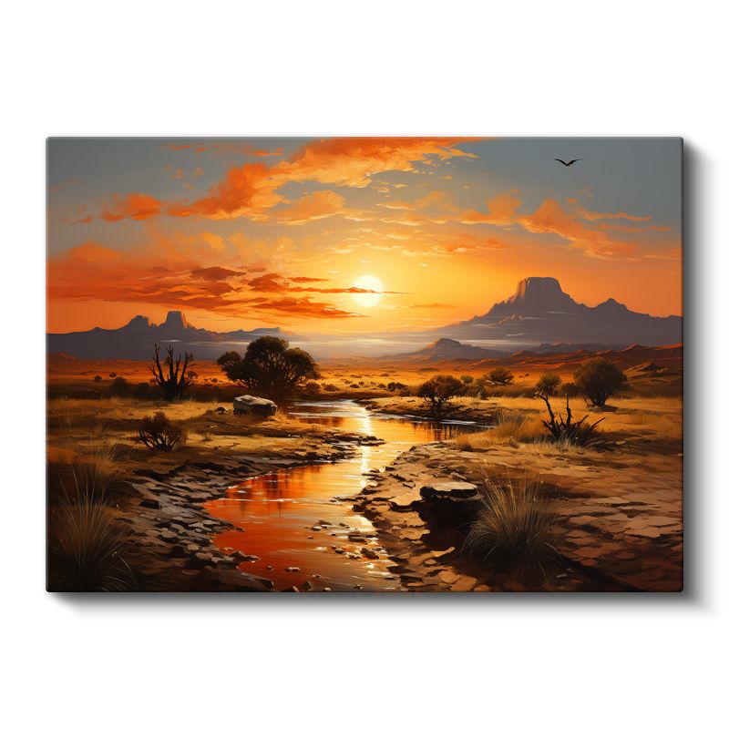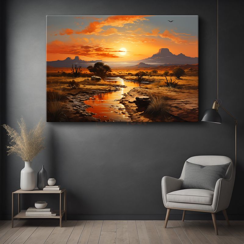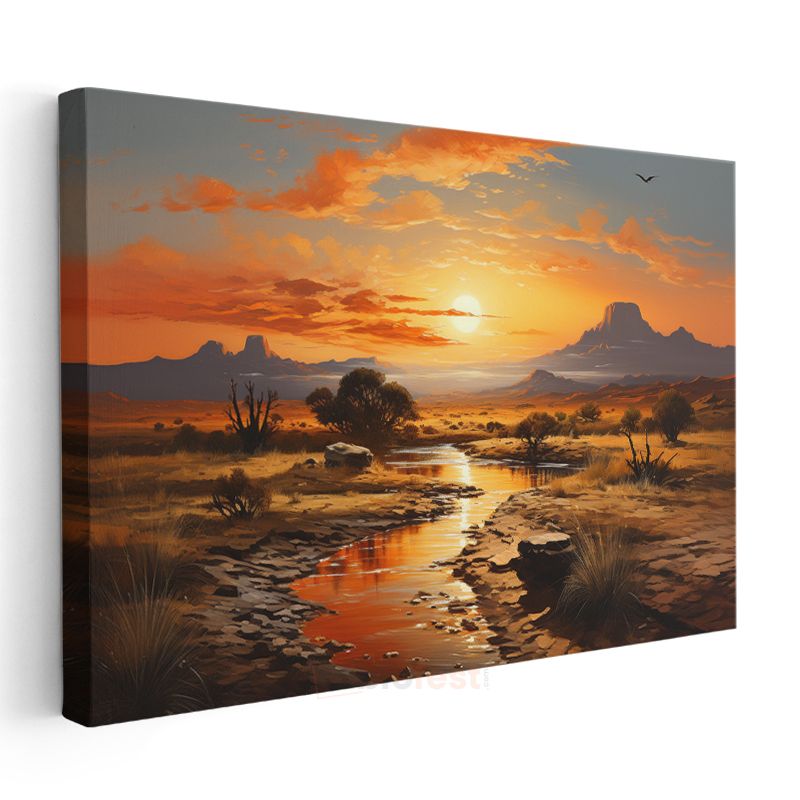 Çöl Vadisi - Turuncu Gün Batımında Akan Dere Kanvas Tablo