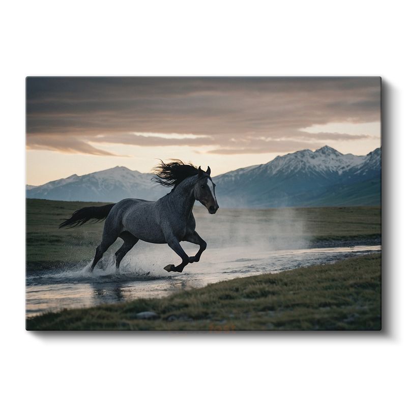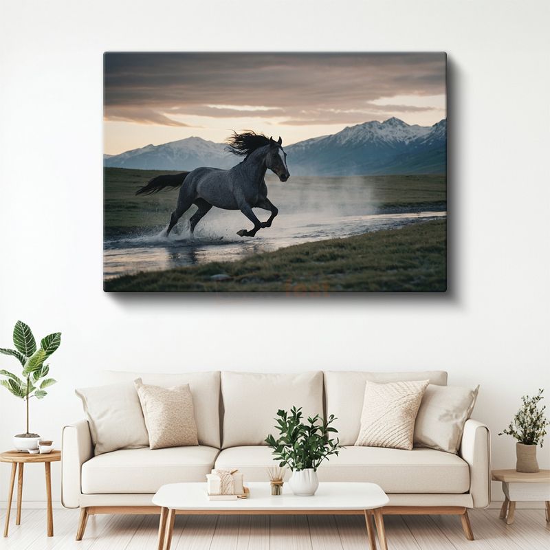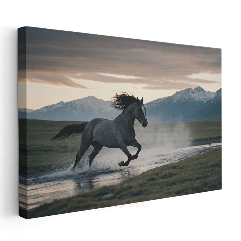 Dağ Atı - Sığ Suda İlerleyen Gri Yabani Kanvas Tablo