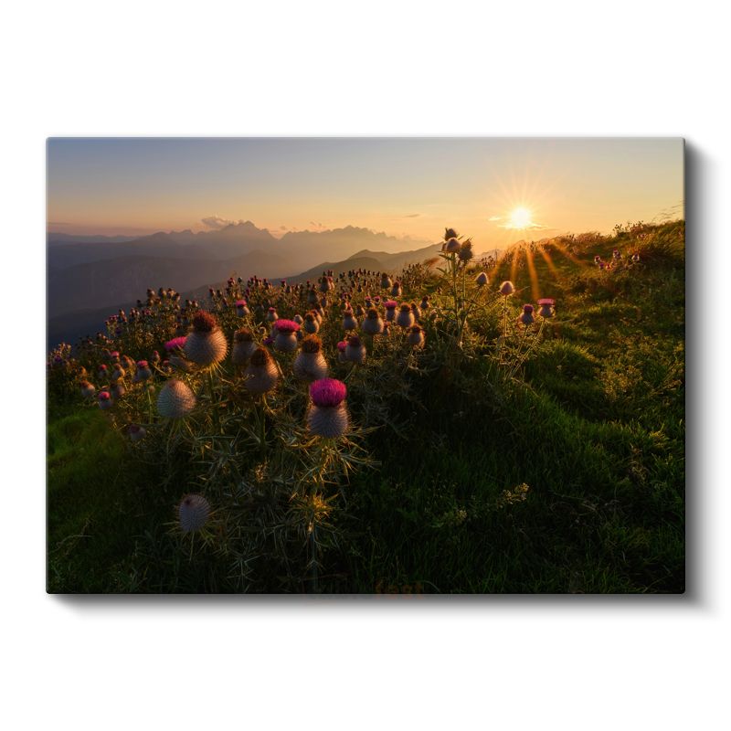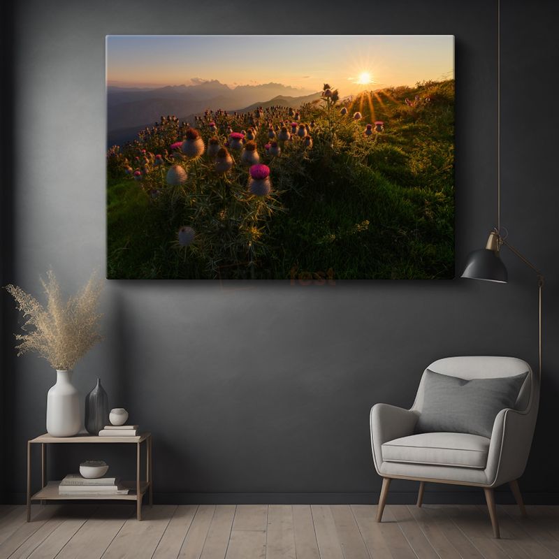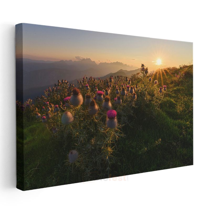 Dağ Çiçekleri - Gün Batımında Mor Dikenler Kanvas Tablo