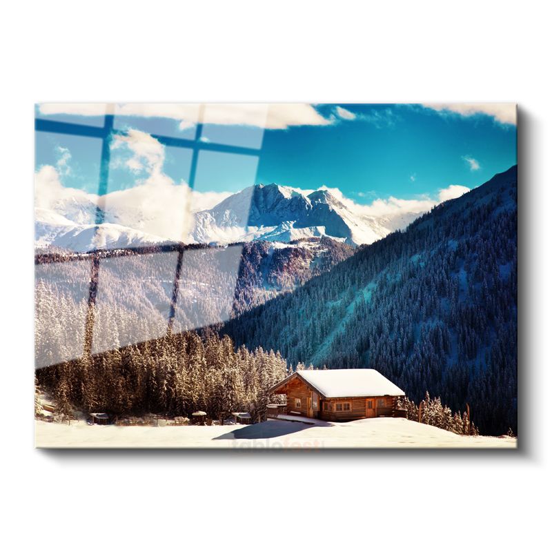 Dağ Evi - Karlı Zirveler Arasında Kış Manzarası Cam Tablo