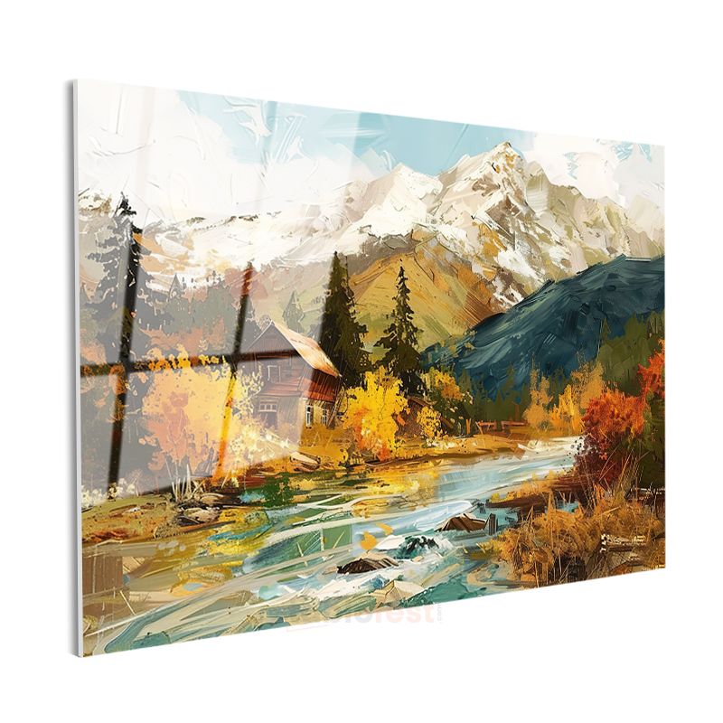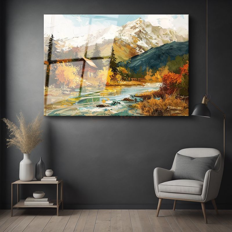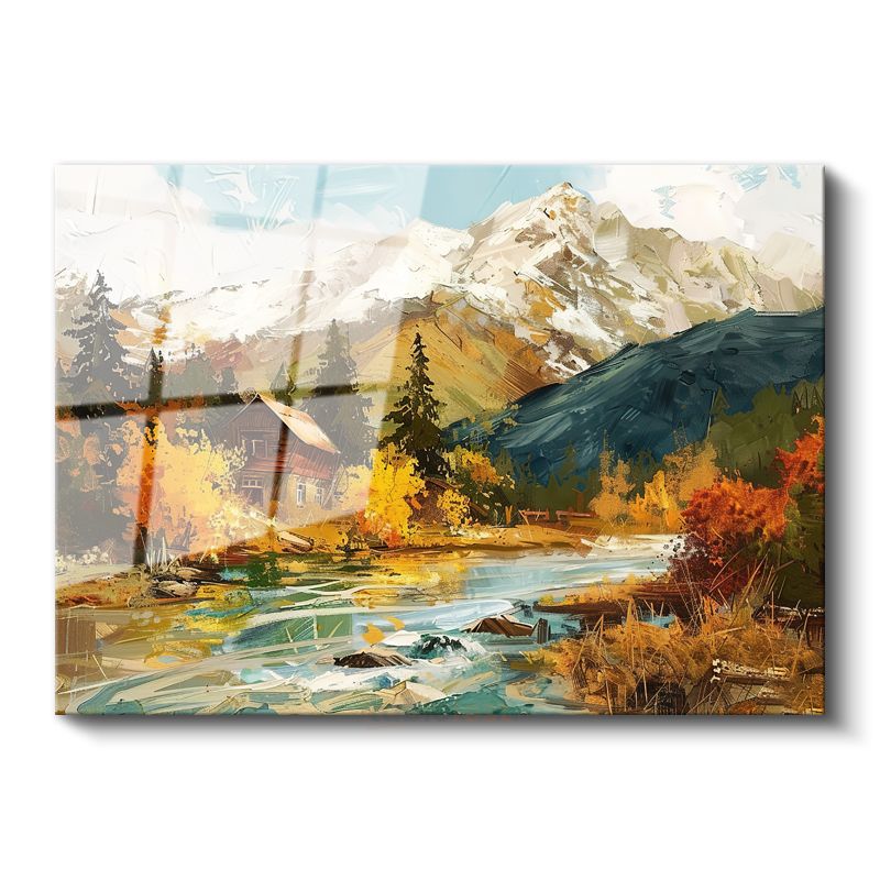 Dağ Evi - Sonbahar Renklerinde Akan Nehir Manzarası Cam Tablo