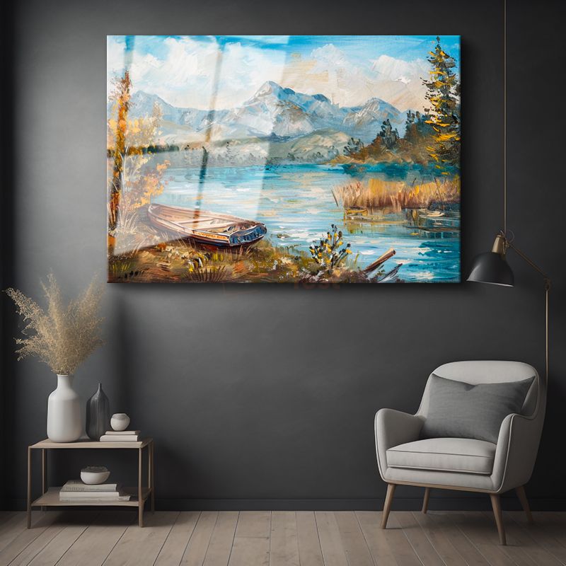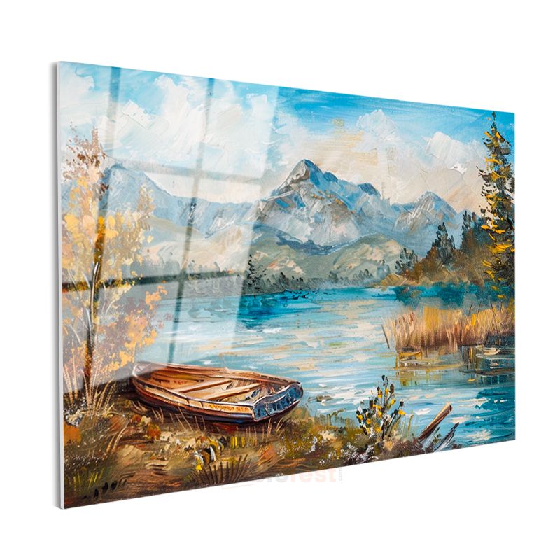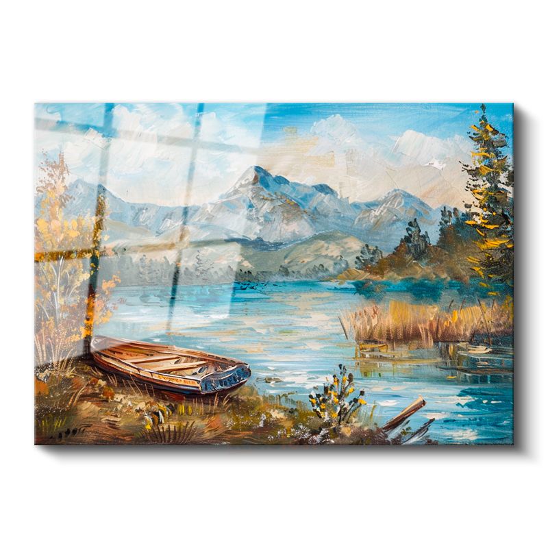 Dağ Gölü - Ahşap Tekne ve Sonbahar Renkleri Cam Tablo