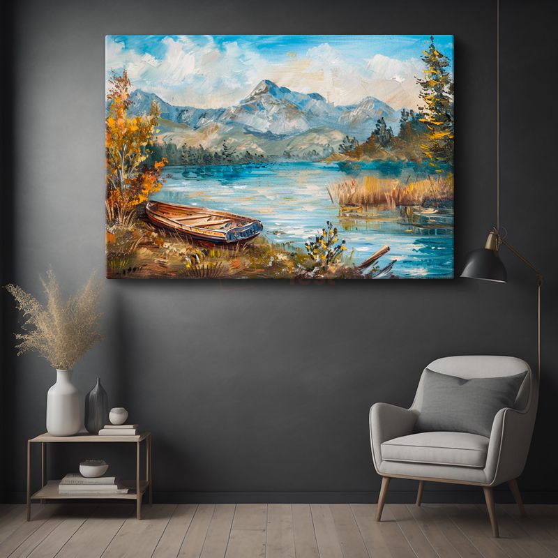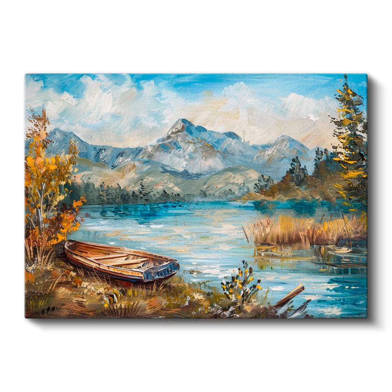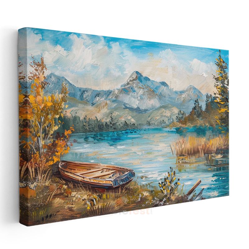 Dağ Gölü - Ahşap Tekne ve Sonbahar Renkleri Kanvas Tablo