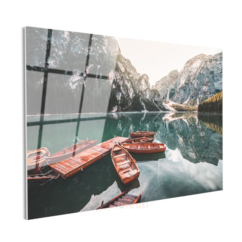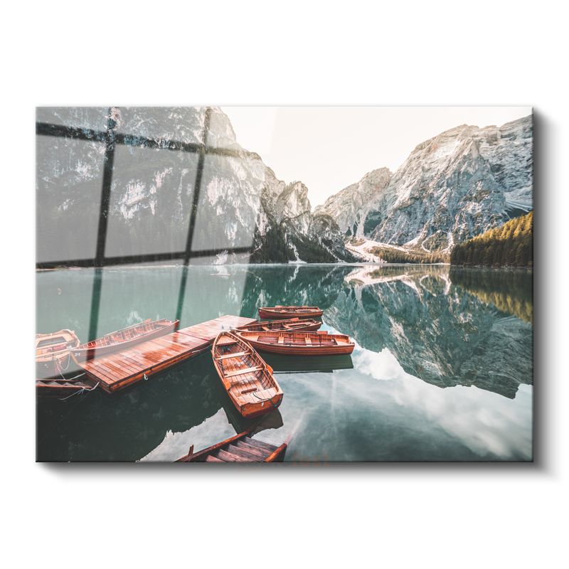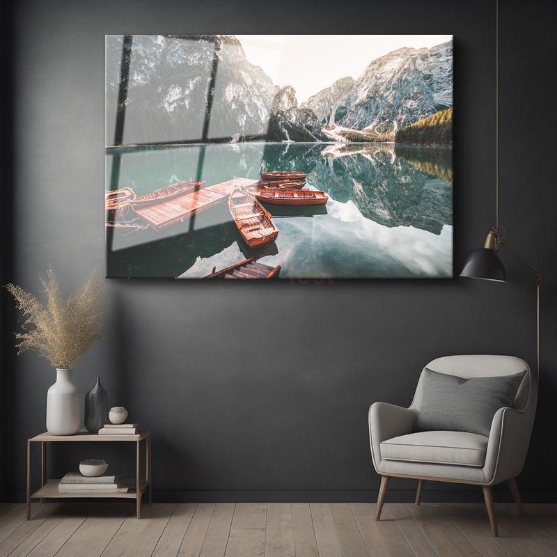 Dağ Gölü - Ahşap Tekneler ve Turkuaz Sular Cam Tablo