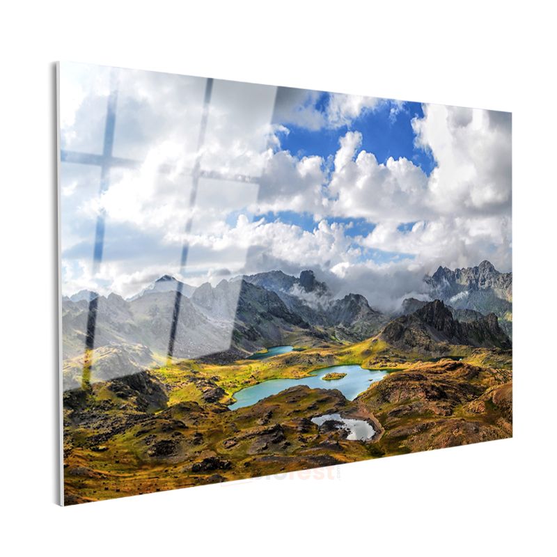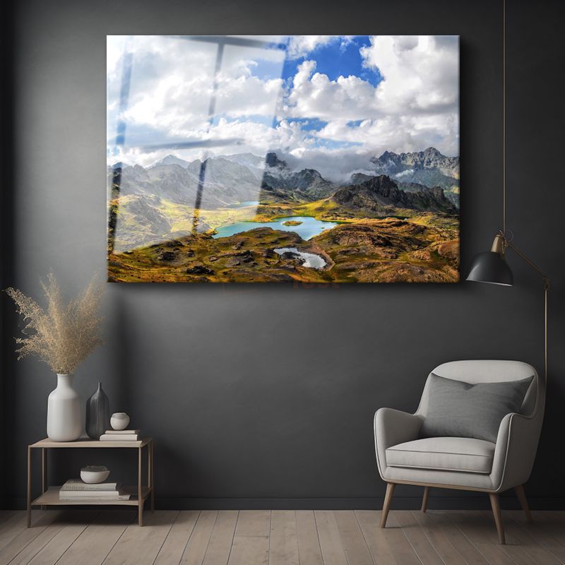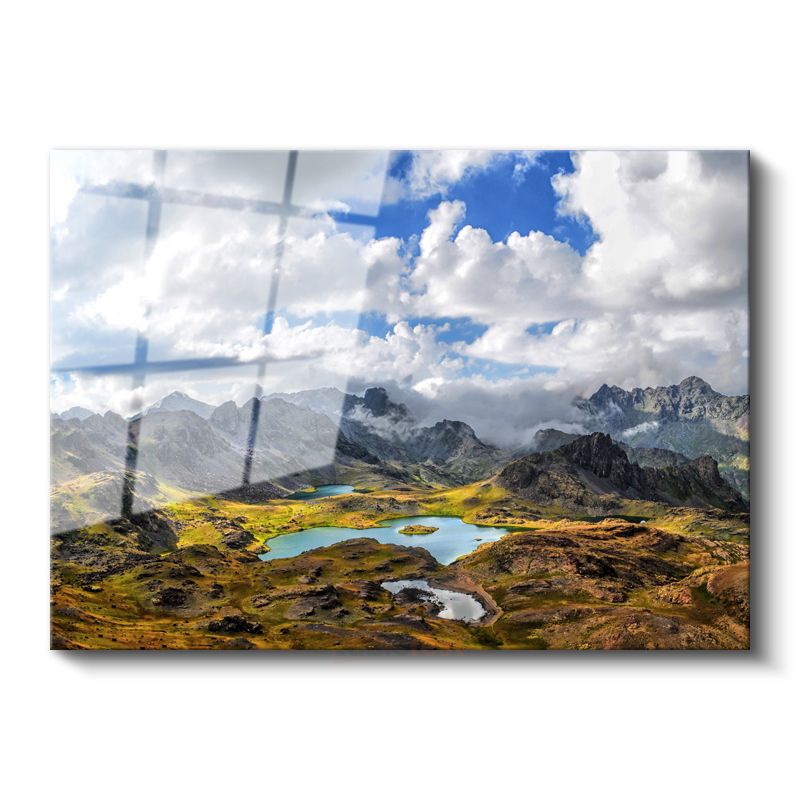 Dağ Gölü - Bulutların Arasından Yükselen Zirveler Cam Tablo