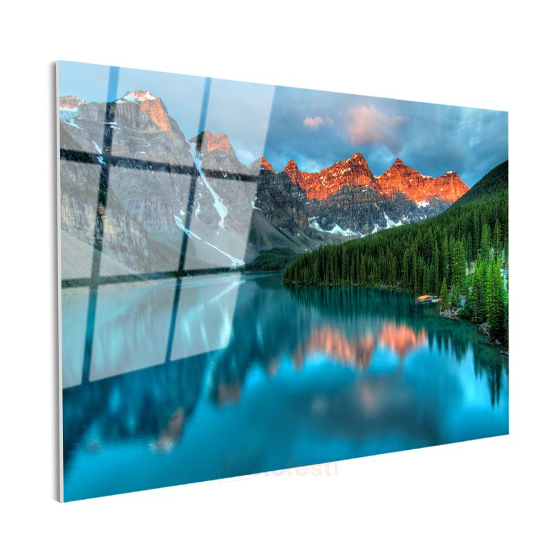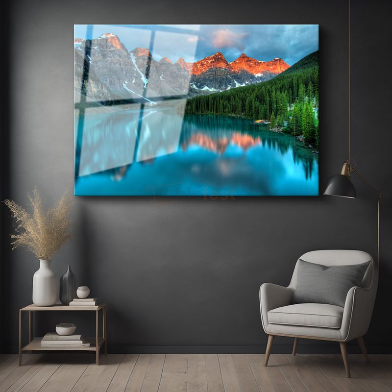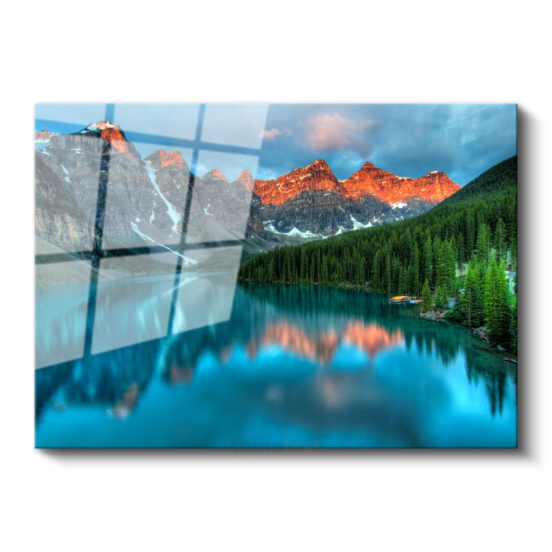 Dağ Gölü - Gün Batımında Yansıyan Zirveler Cam Tablo