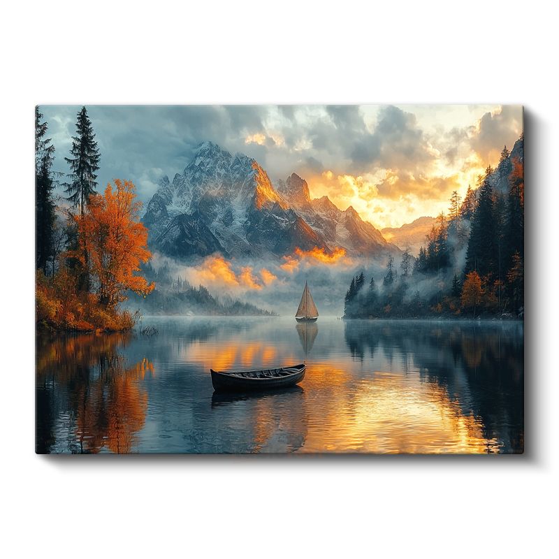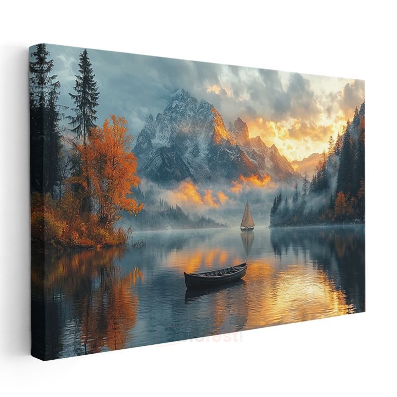 Dağ Gölü Manzarası - Sonbahar Işığında Tekne Yolculuğu Kanvas Tablo