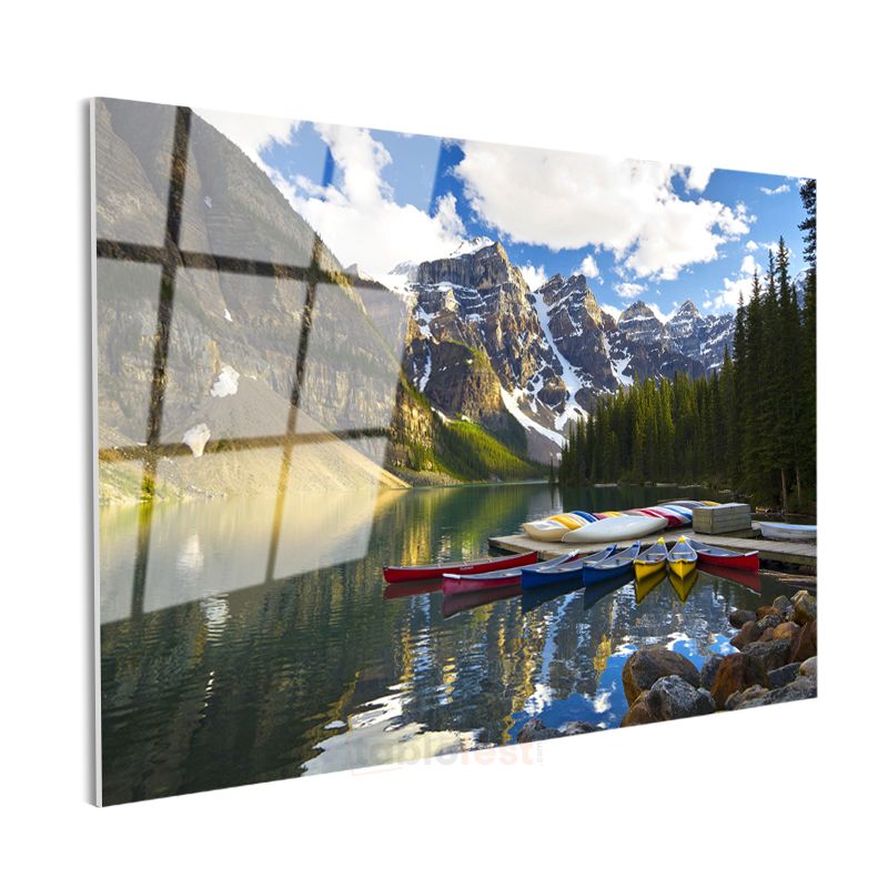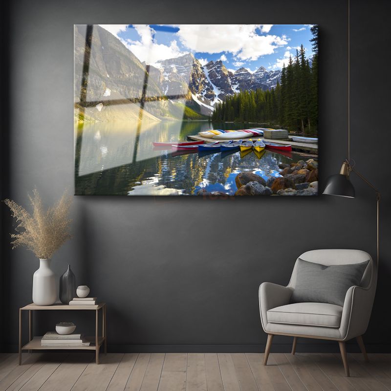 Dağ Gölü - Renkli Kanolar ve Karlı Zirveler Cam Tablo