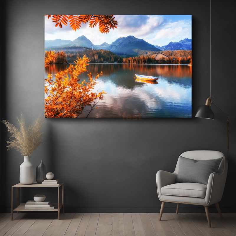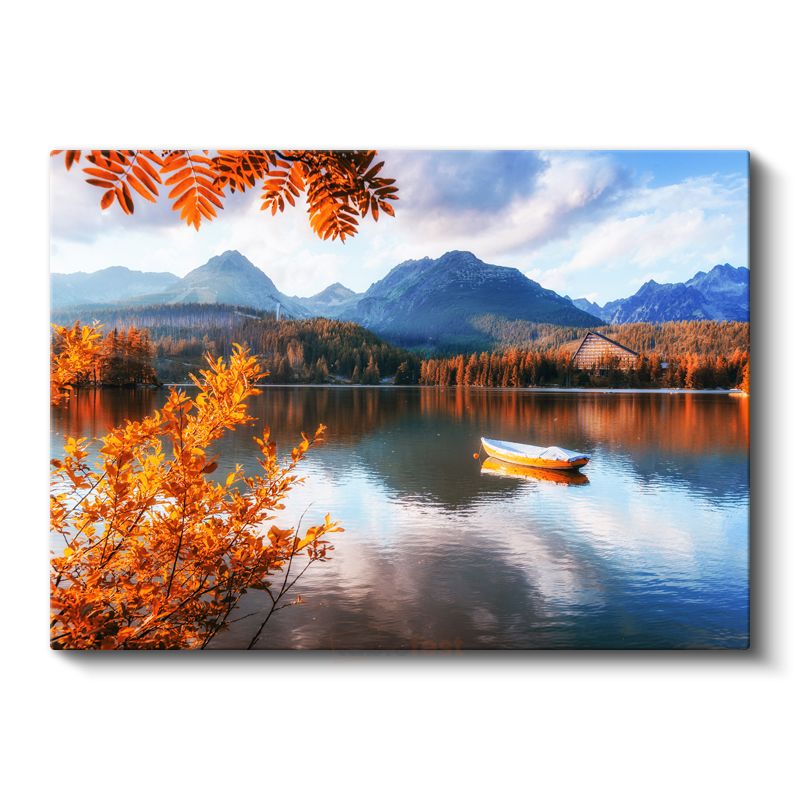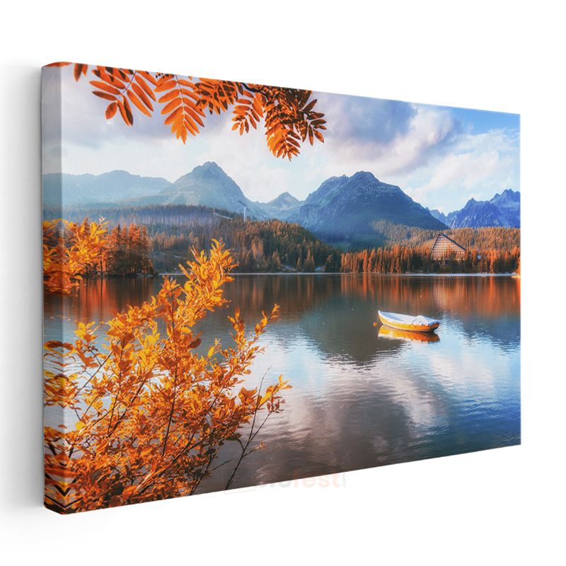 Dağ Gölü - Sonbahar Renkli Tekne Manzarası Kanvas Tablo