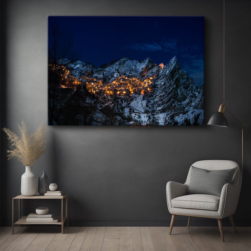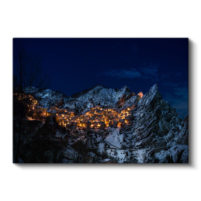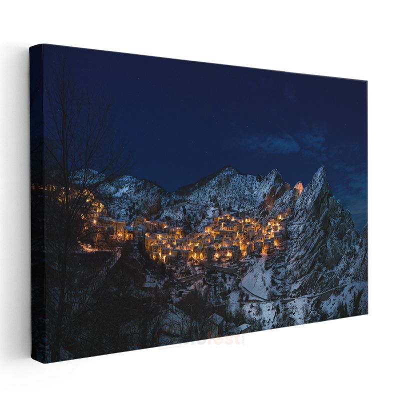 Dağ Köyü - Karanlıkta Işıldayan Gece Manzarası Kanvas Tablo