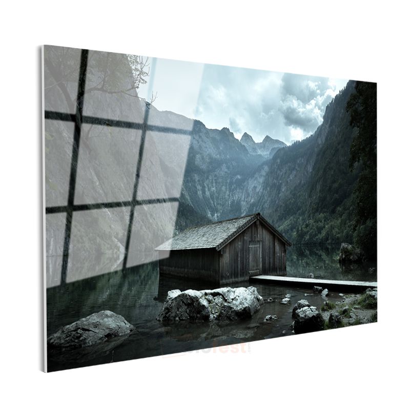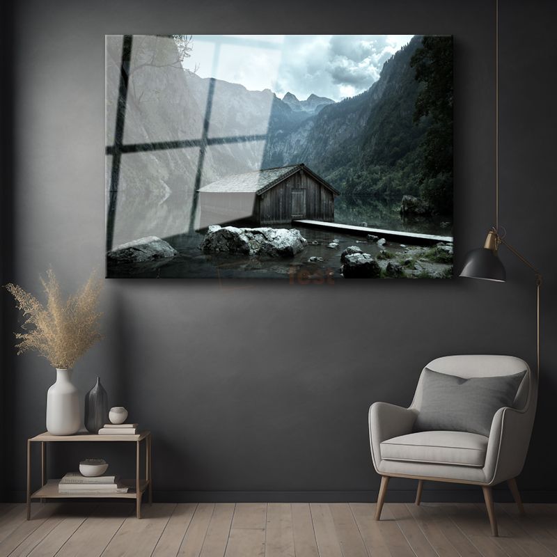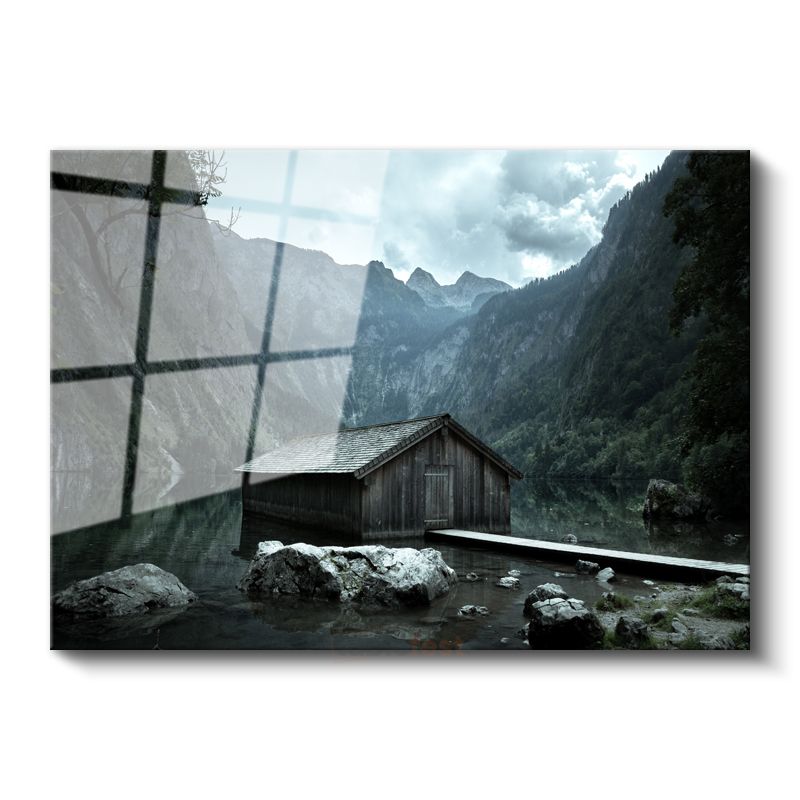 Dağ Kulübesi - Huzurlu Göl Kenarı Cam Tablo