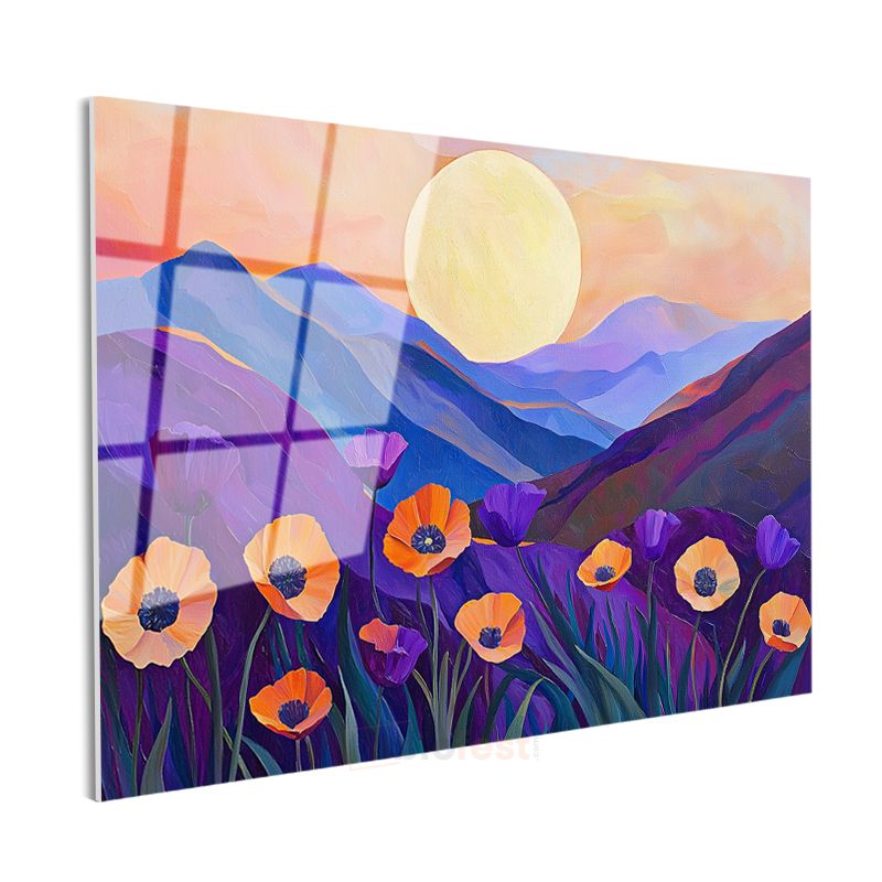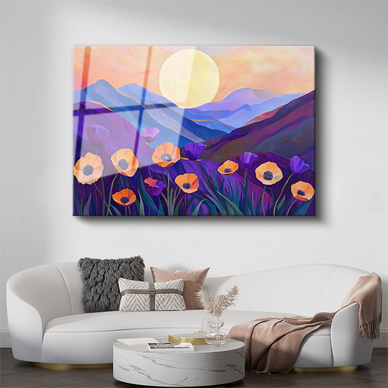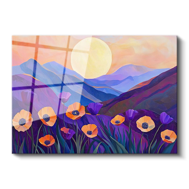 Dağ Manzarası - Gelincik Tarlalı Gün Batımı Cam Tablo