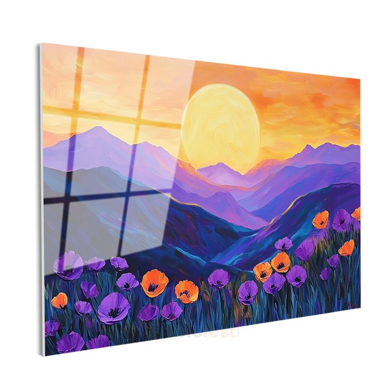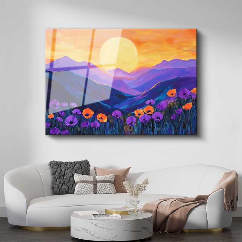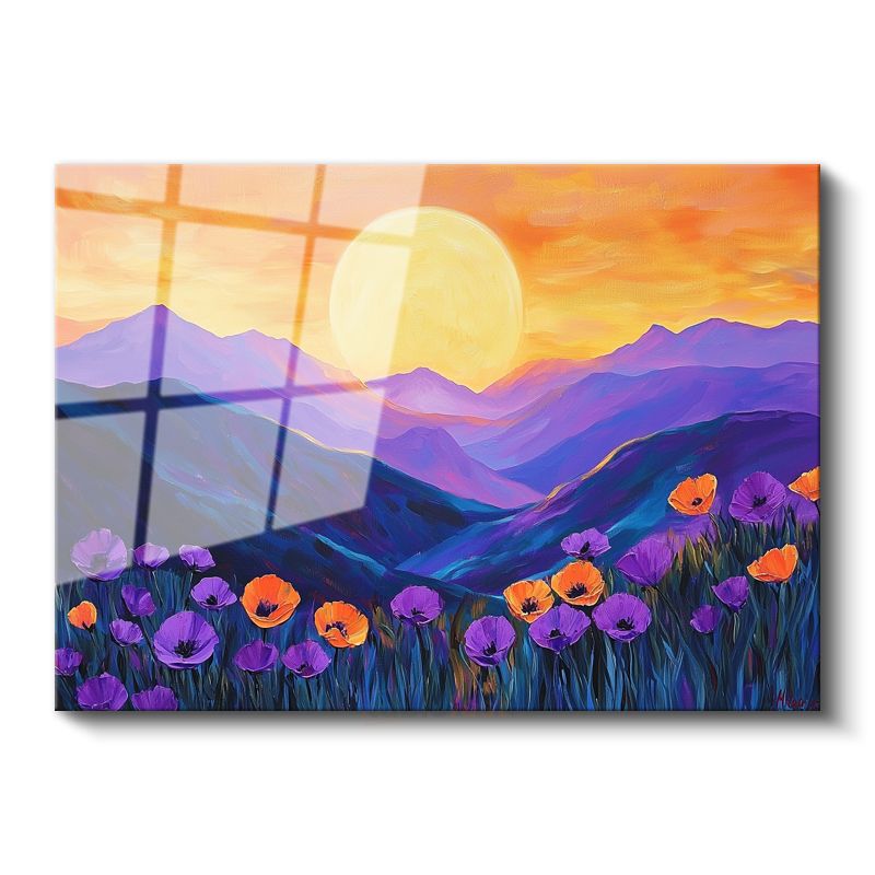 Dağ Manzarası - Mor Turuncu Gelincikli Cam Tablo