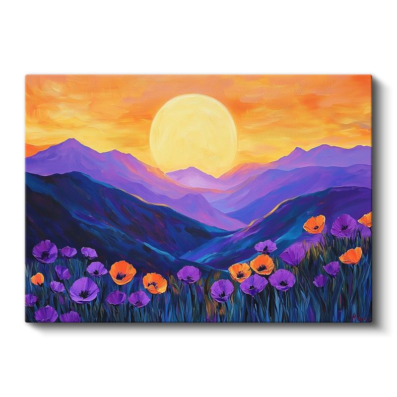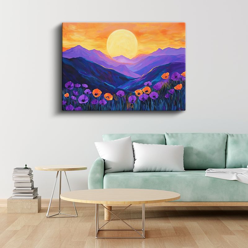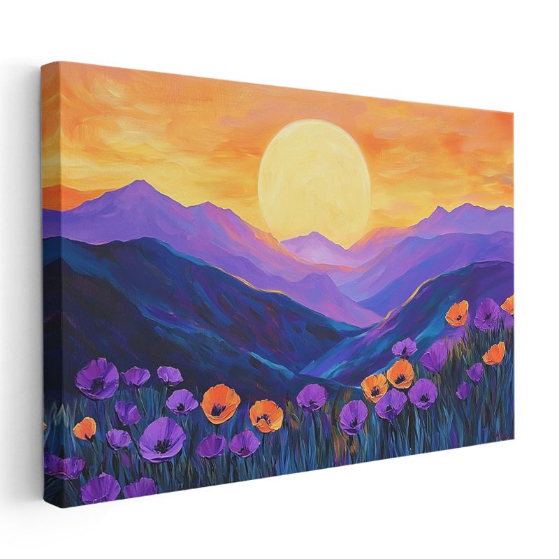 Dağ Manzarası - Mor Turuncu Gelincikli Kanvas Tablo