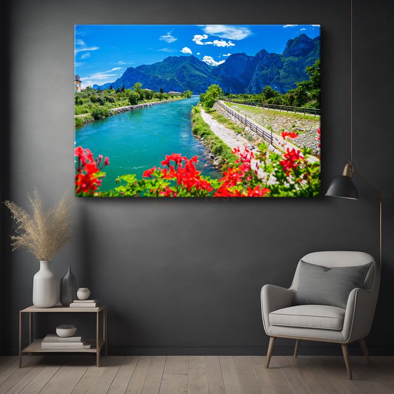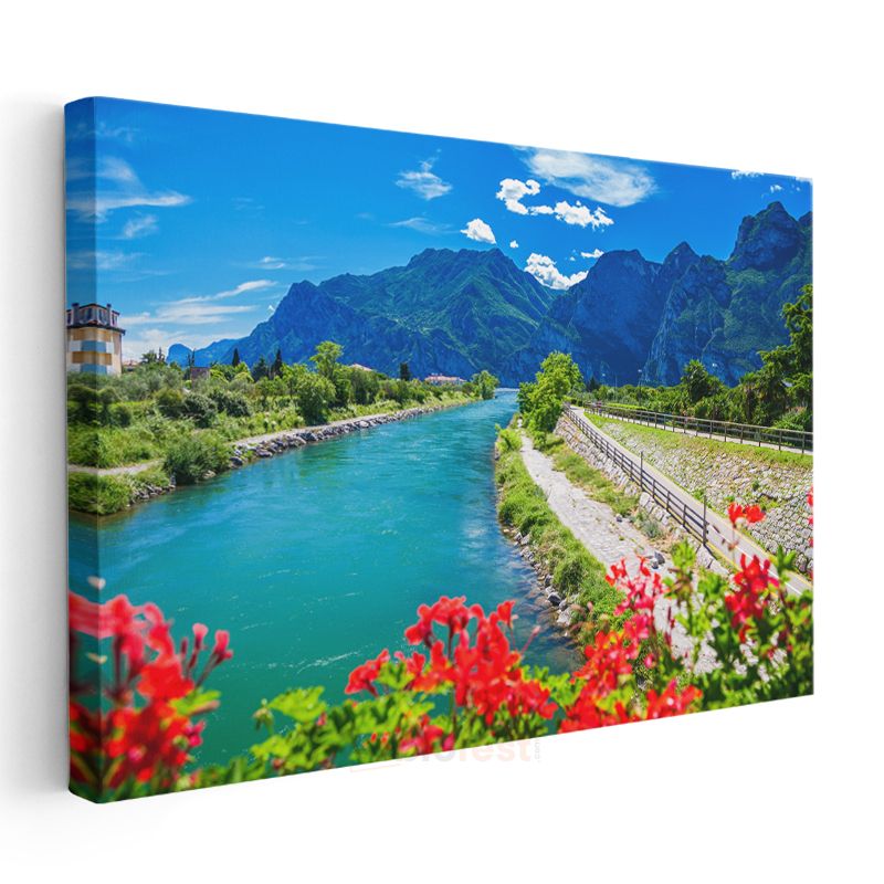 Dağ Nehri - Turkuaz Sular ve Kırmızı Çiçeklerle Çevrili Vadi Kanvas Tablo
