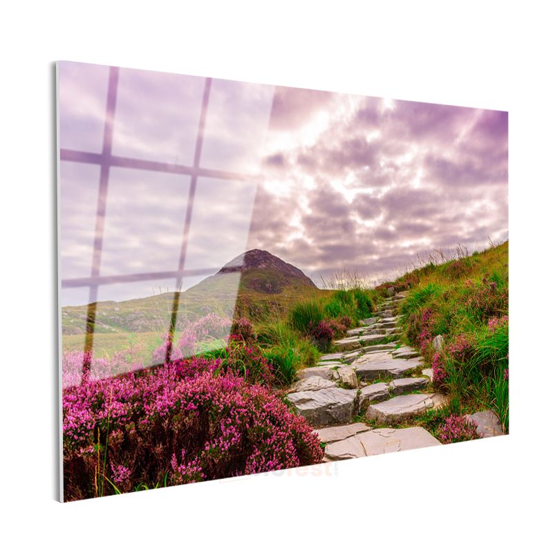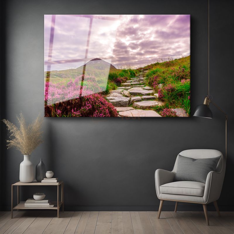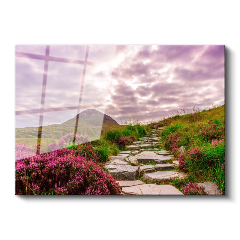 Dağ Patikası - Mor Çiçeklerle Bezeli Taş Yol Cam Tablo