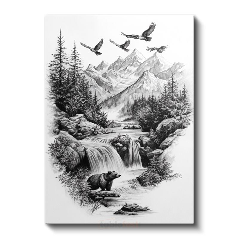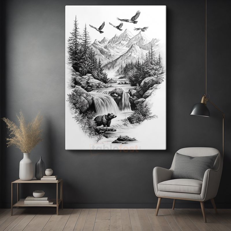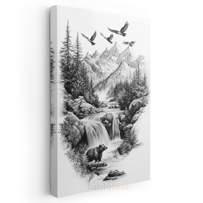 Dağ Şelalesi - Siyah Beyaz Vahşi Doğa Kanvas Tablo