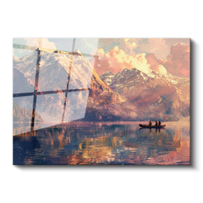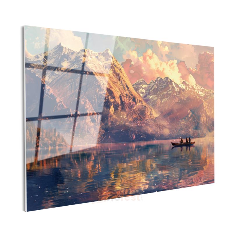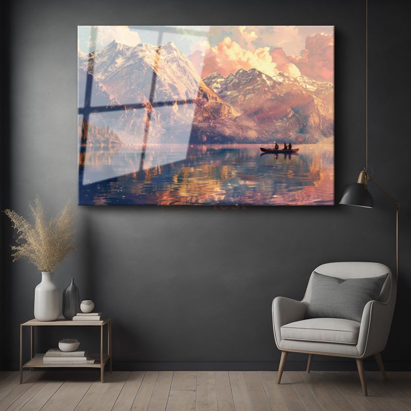 Dağ Silüeti - Göl Üzerinde Yolculuk Cam Tablo