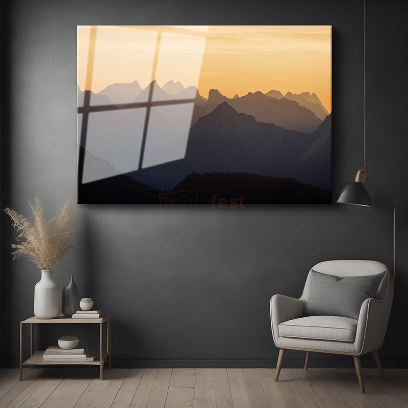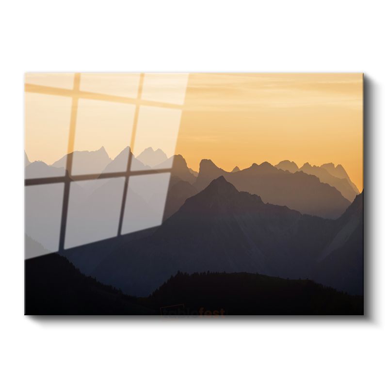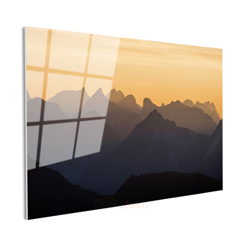 Dağ Silüetleri - Gün Batımında Altın Işıkla Aydınlanan Zirveler Cam Tablo