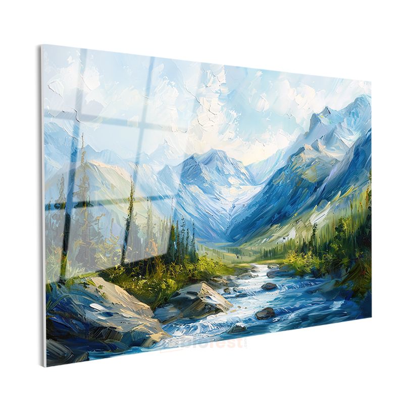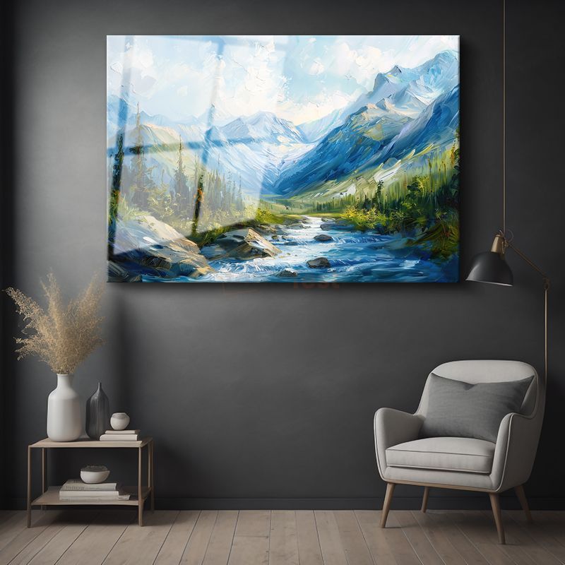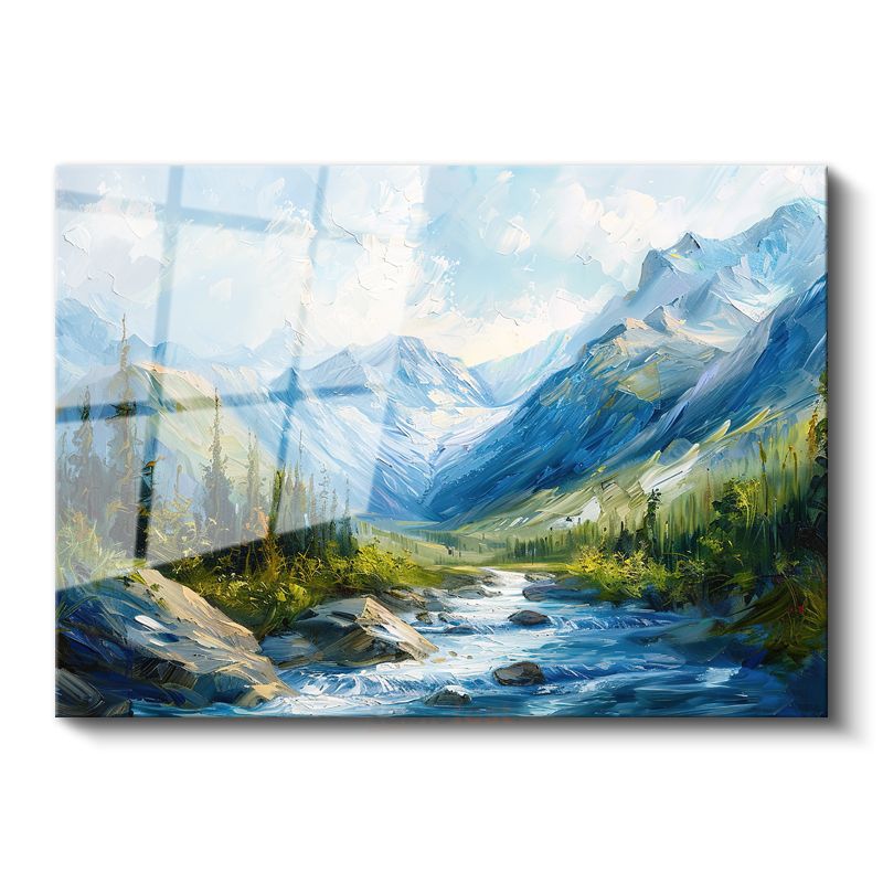 Dağ Vadisi - Mavi Sularla Buluşan Yeşil Orman Cam Tablo