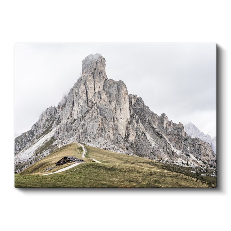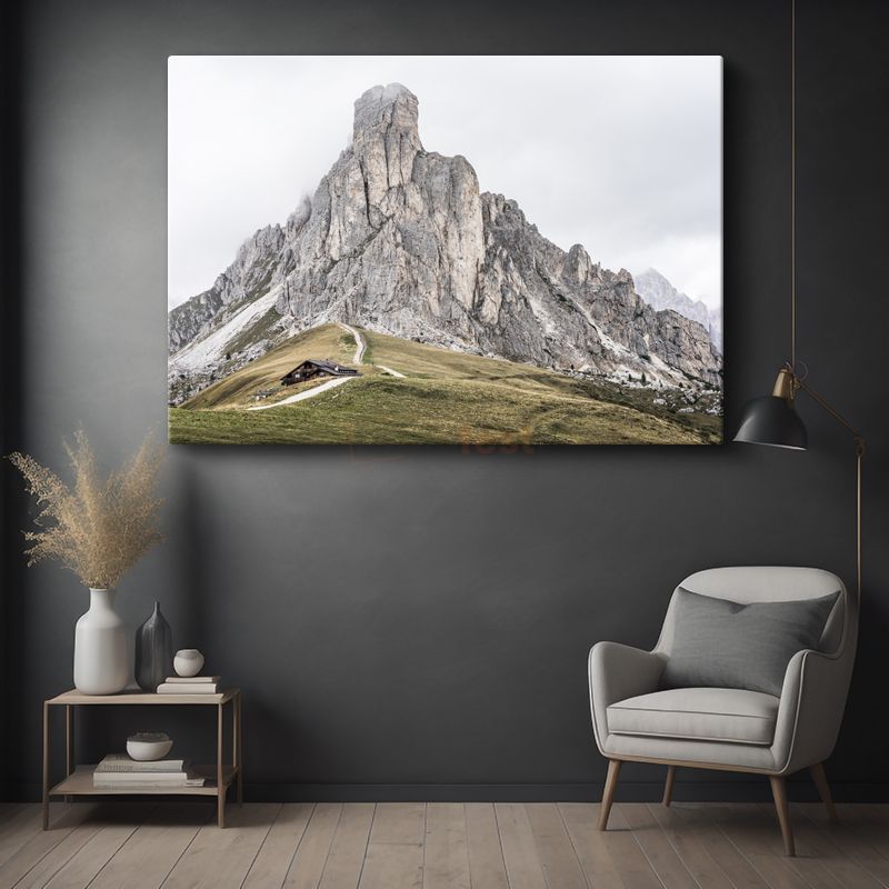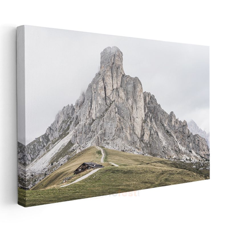 Dağ Zirvesi - Heybetli Kayalık ve Yeşil Vadideki Dağ Evi Kanvas Tablo