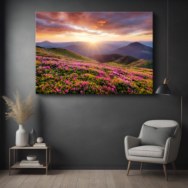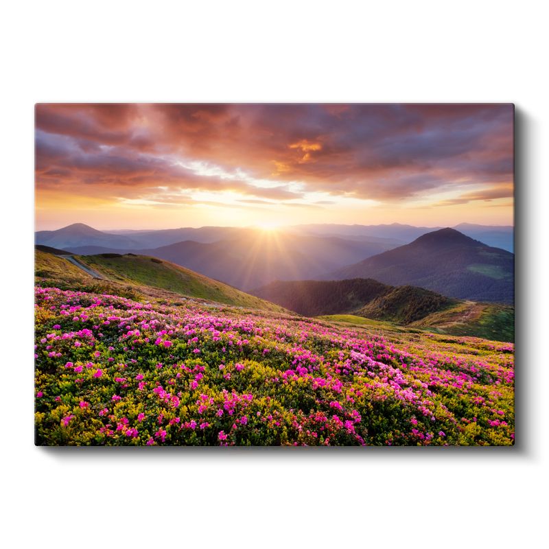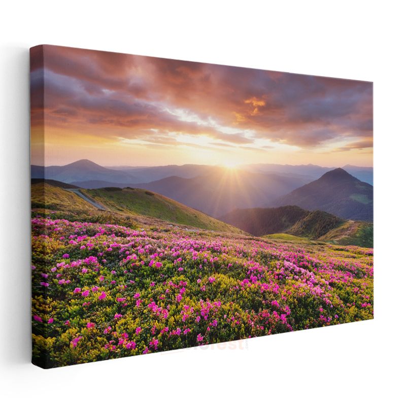 Dağ Zirvesi - Pembe Çiçeklerle Bezeli Gün Batımı Kanvas Tablo