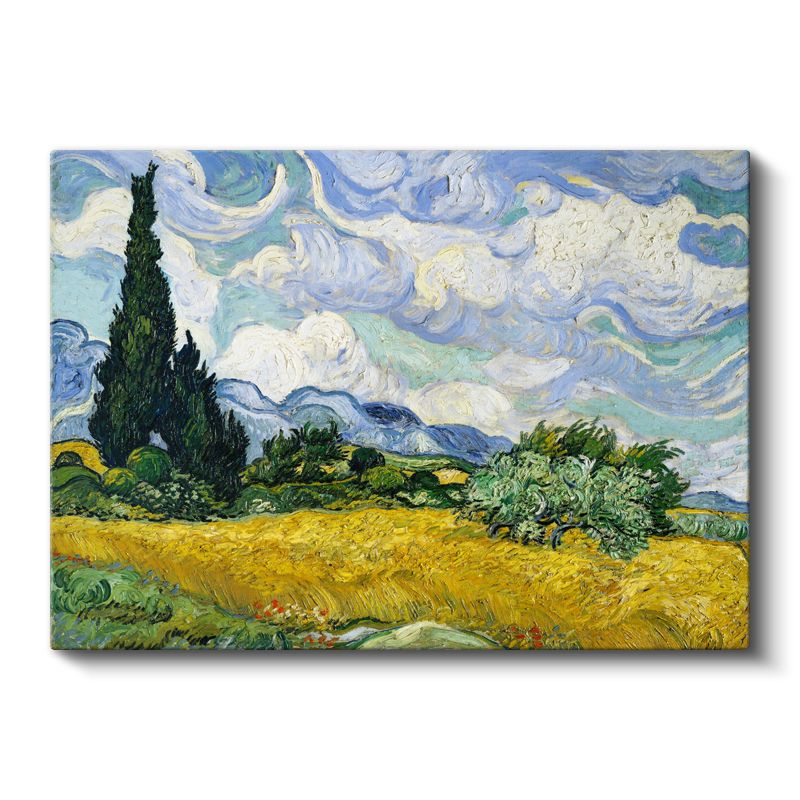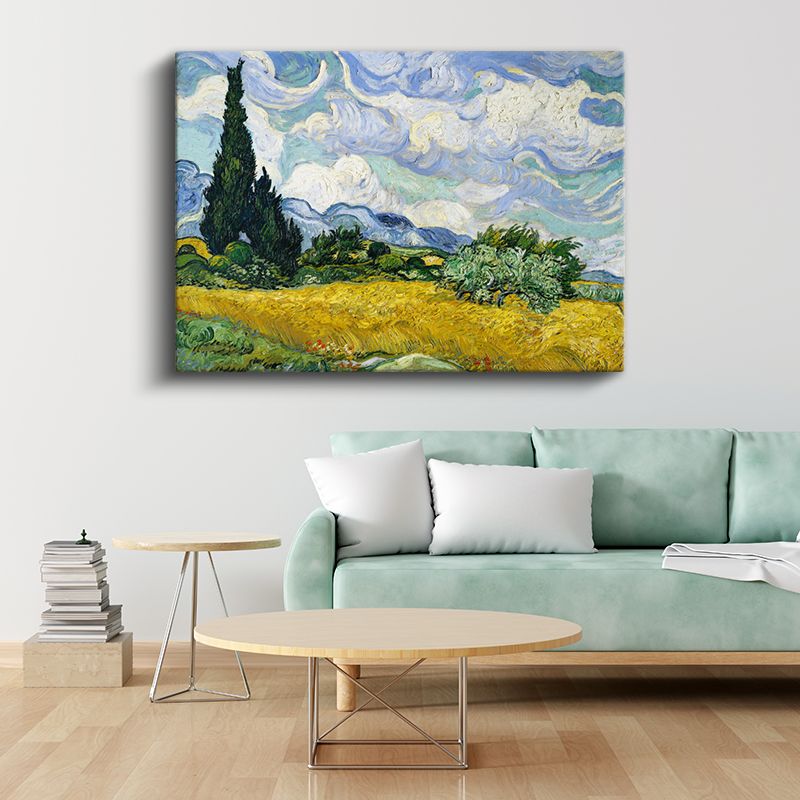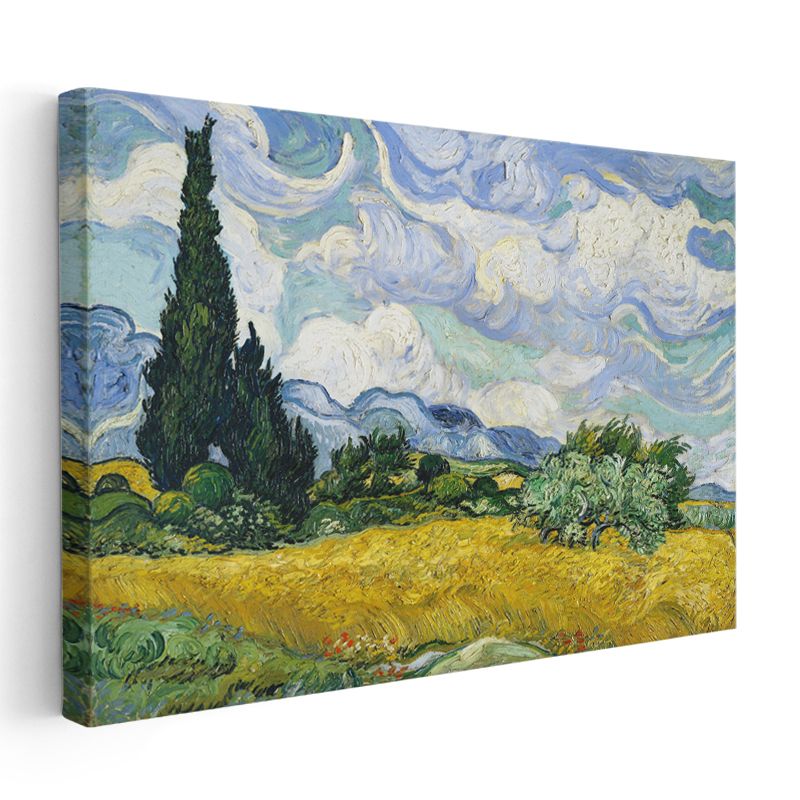 Dalgalı Gökyüzü - Sarı Tarla Yeşil Servi Kanvas Tablo