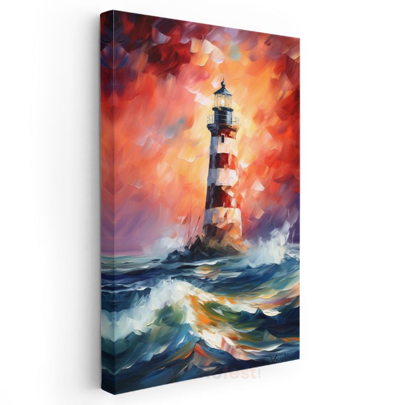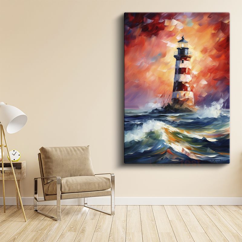 Deniz Feneri - Dalgalı Denizde Kırmızı Beyaz Işık Kanvas Tablo