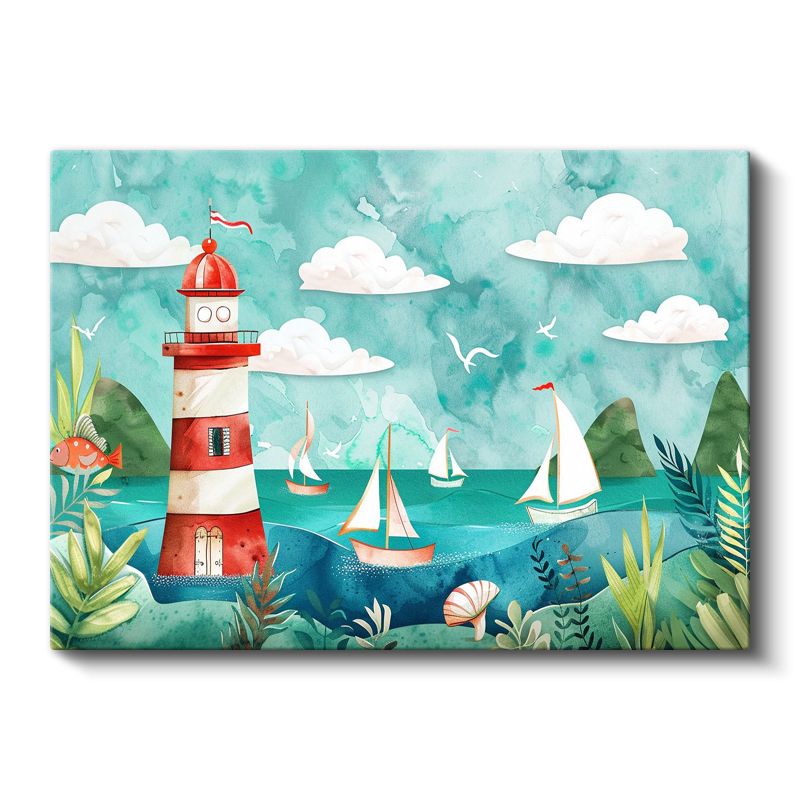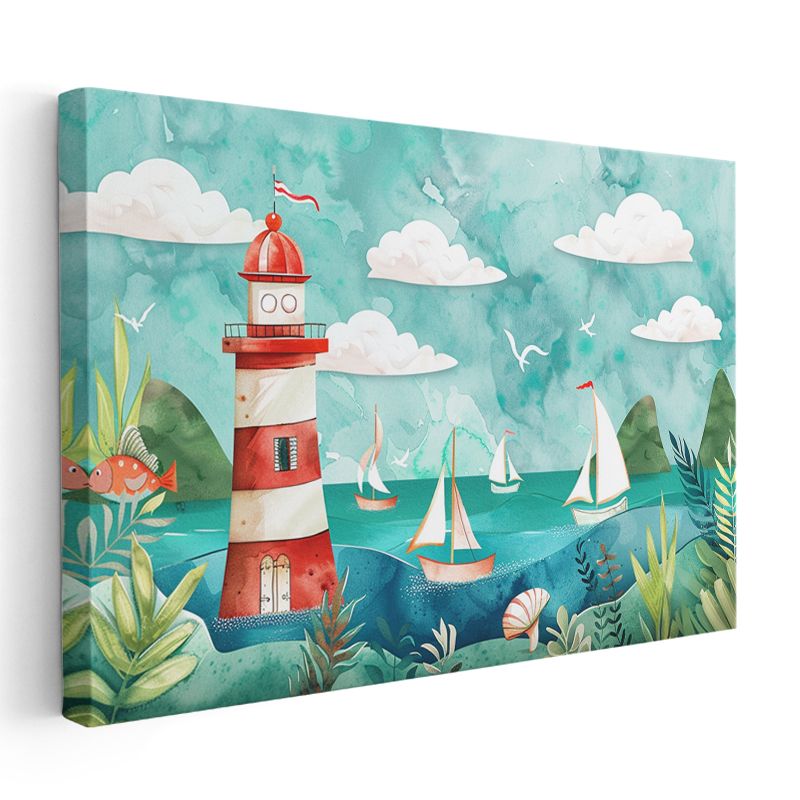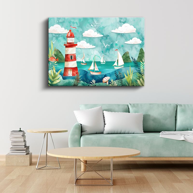 Deniz Feneri - Turkuaz Sularda Yelkenliler Kanvas Tablo