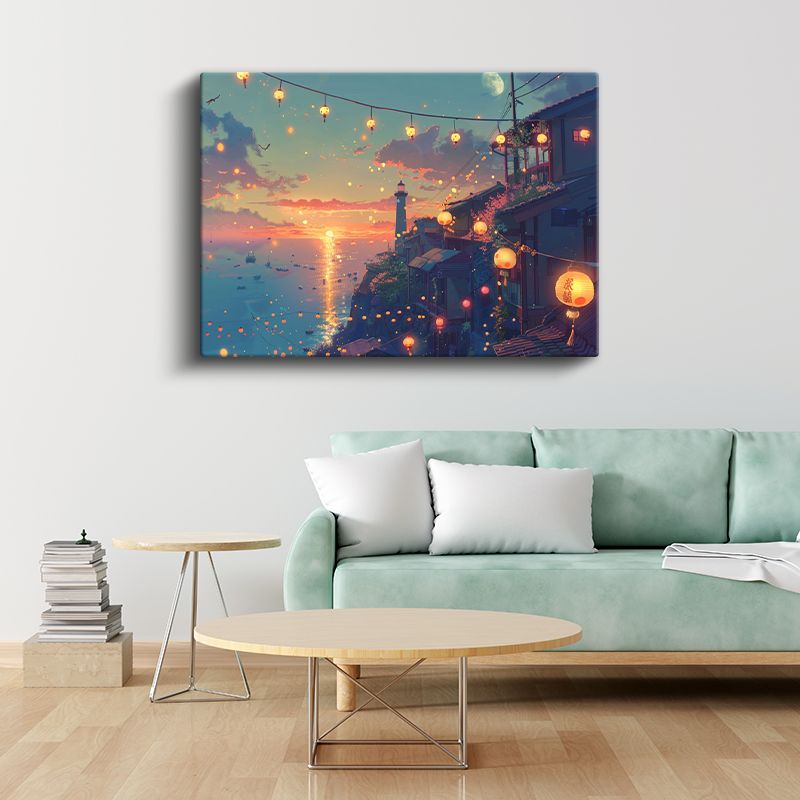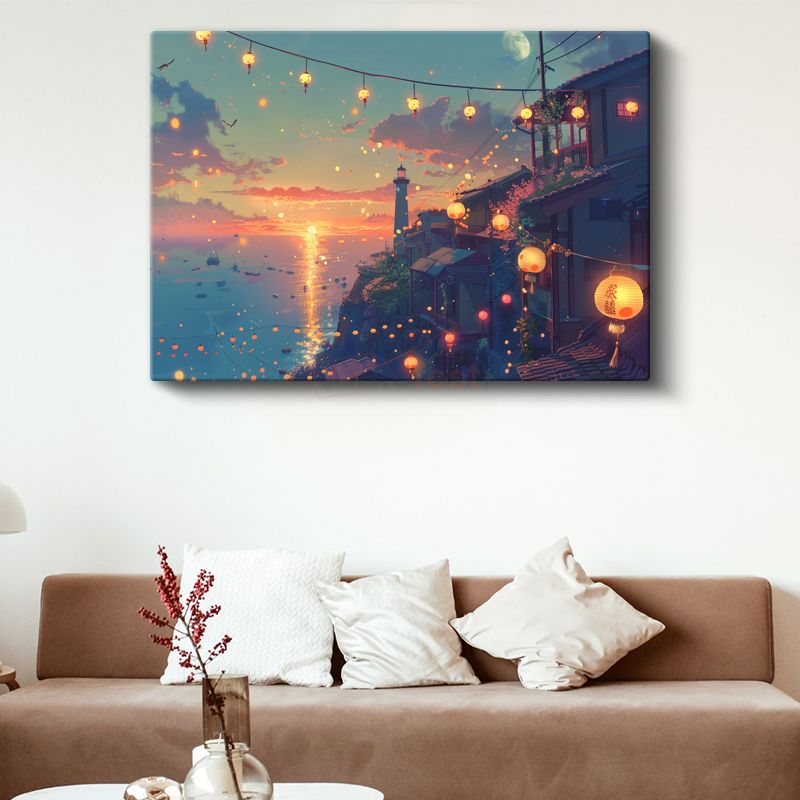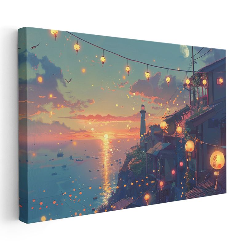 Deniz Feneri - Turuncu Günbatımı Anime Kanvas Tablo