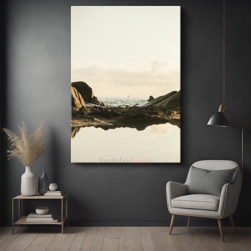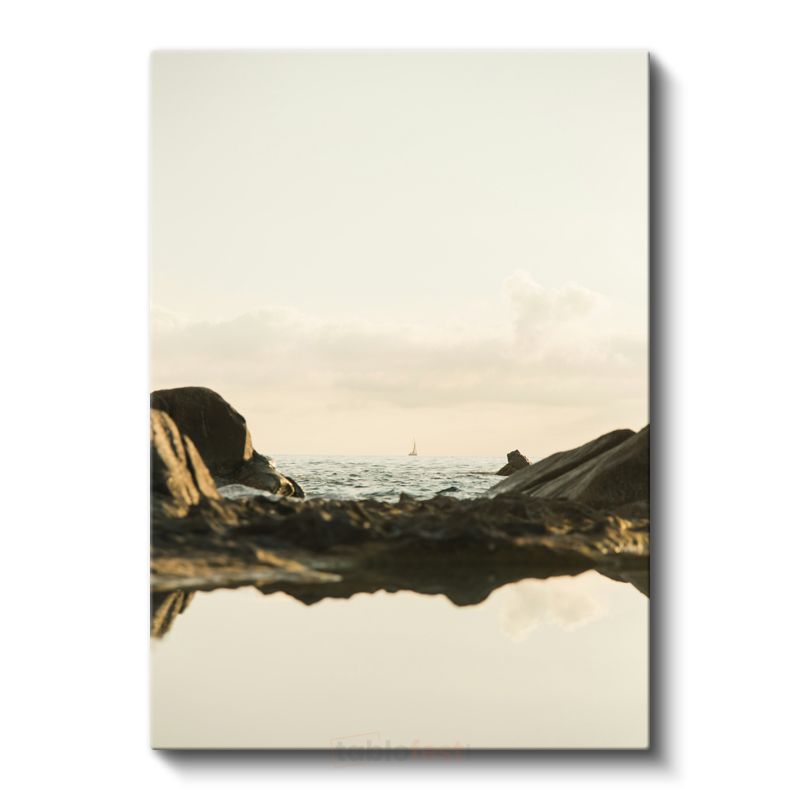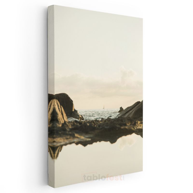 Deniz Huzuru - Kayalıklar Arasından Ufuktaki Yelkenli Kanvas Tablo