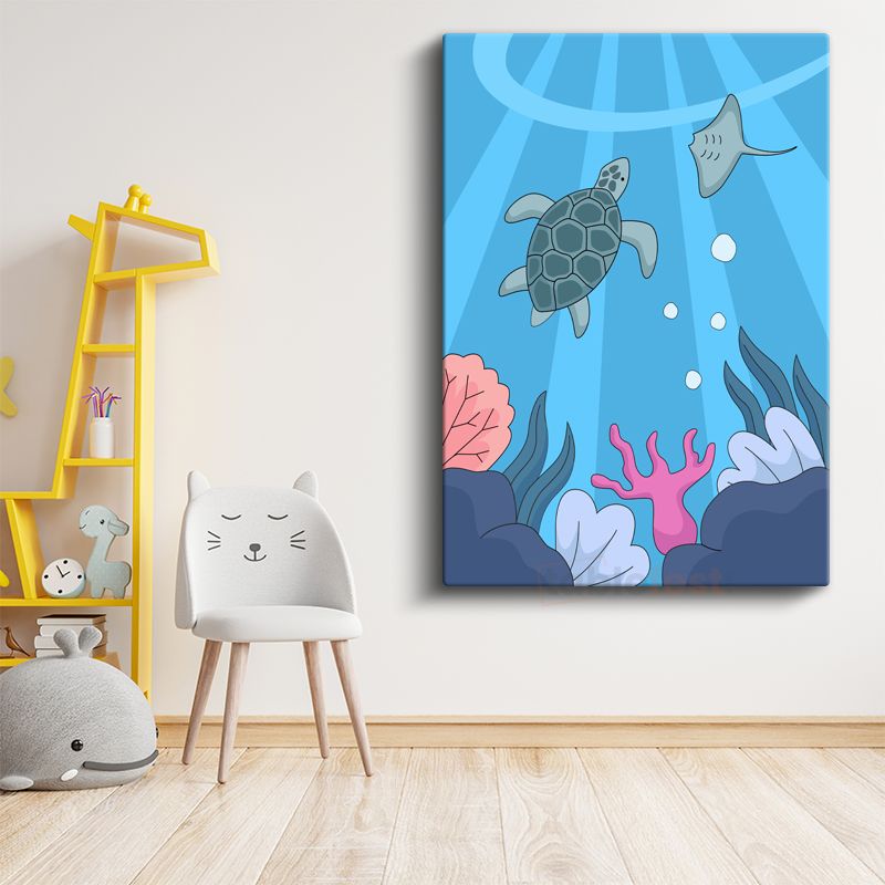 Deniz Kaplumbağası - Renkli Mercanlar Arasında Yüzüş Kanvas Tablo