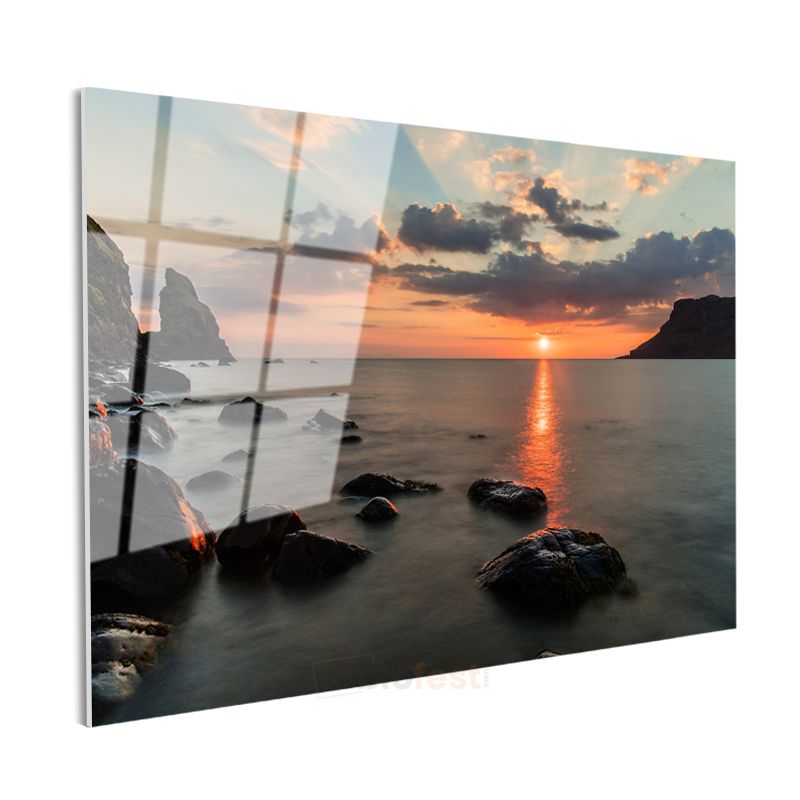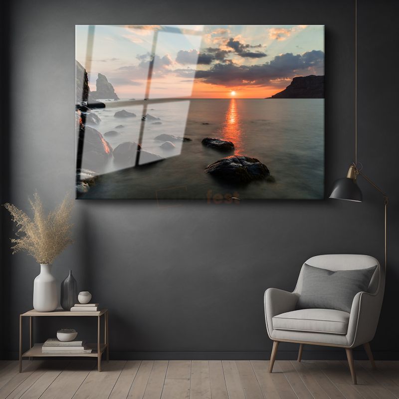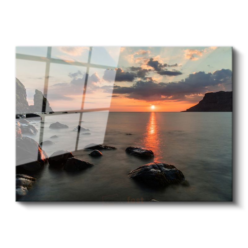 Deniz Kıyısı - Sakin Sularda Yansıyan Günbatımı Işıltısı Cam Tablo