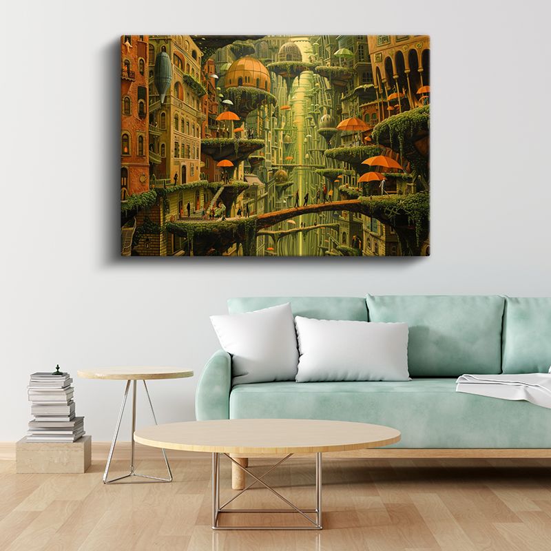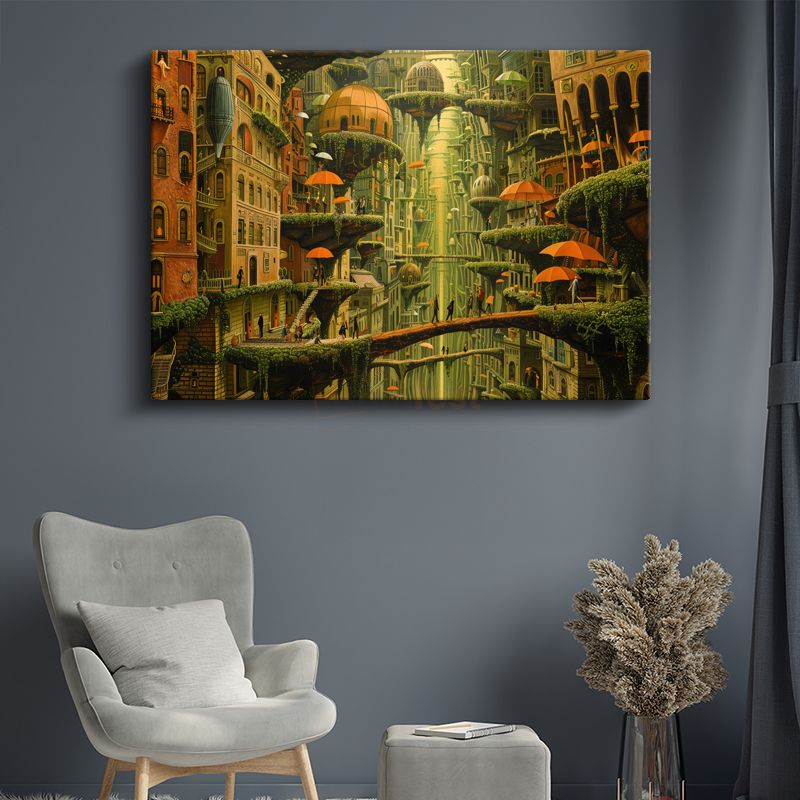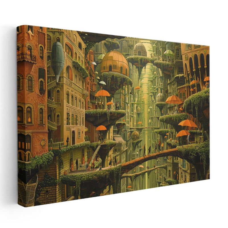 Dikey Şehir - Şelaleler ve Turuncu Şemsiyeler Labirenti Kanvas Tablo