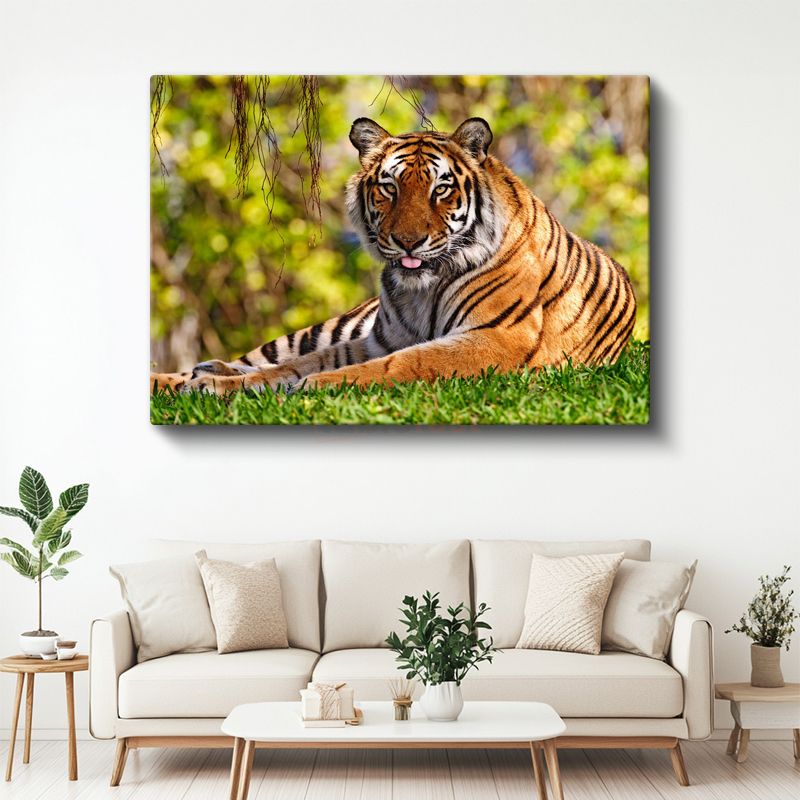 Dinlenen Kaplan - Çimenlerde Uzanan Çizgili Yırtıcı Kanvas Tablo