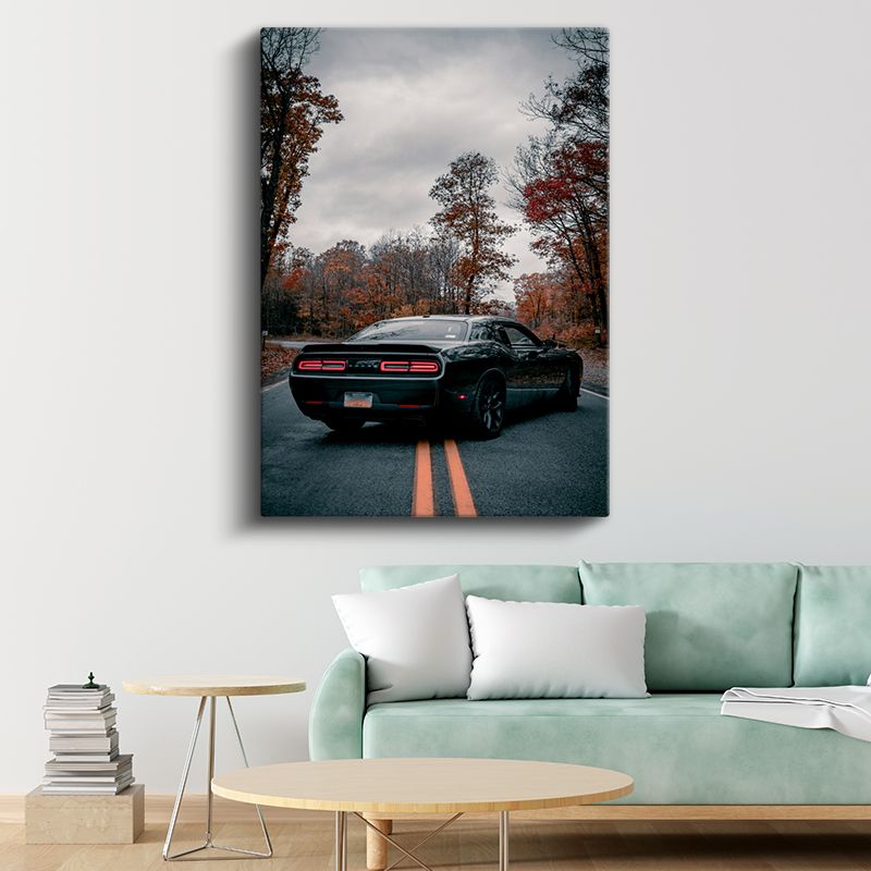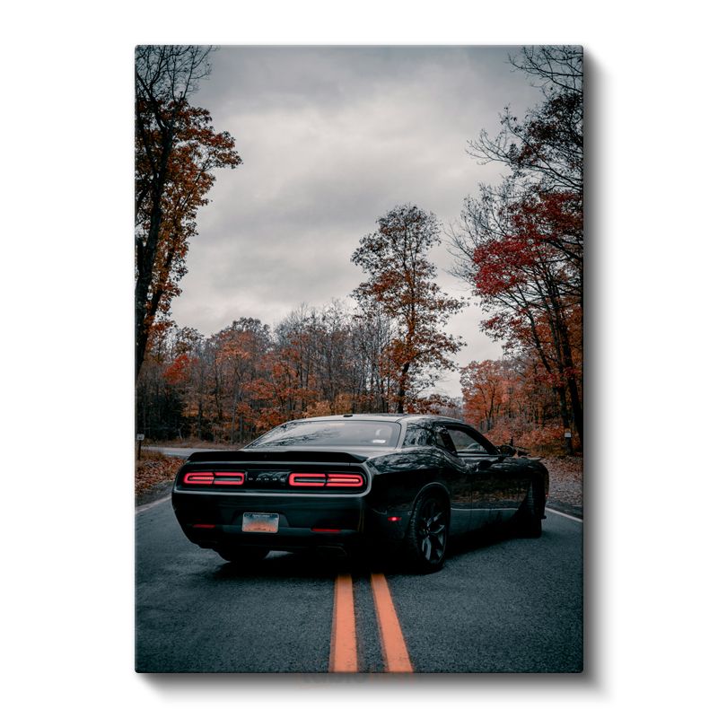 Dodge Challenger - Sonbahar Yolunda Siyah Amerikan Kas Arabası Kanvas Tablo