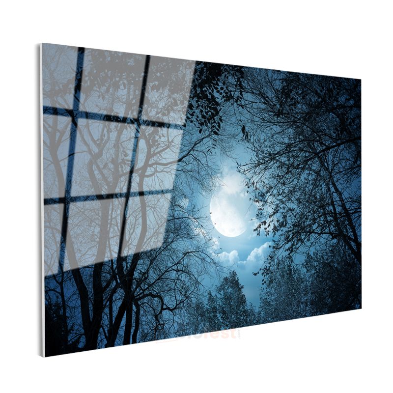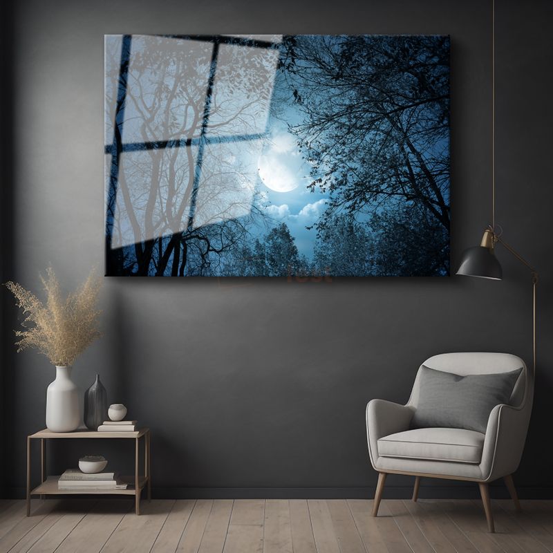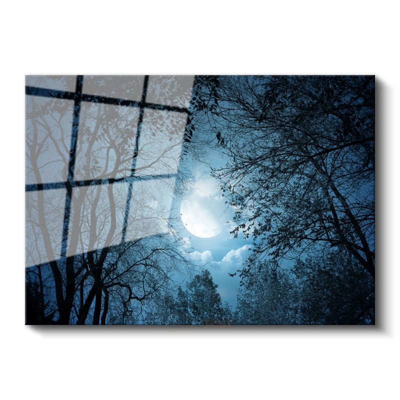 Dolunay Büyüsü - Ağaçların Arasından Parlayan Gece Işığı Cam Tablo