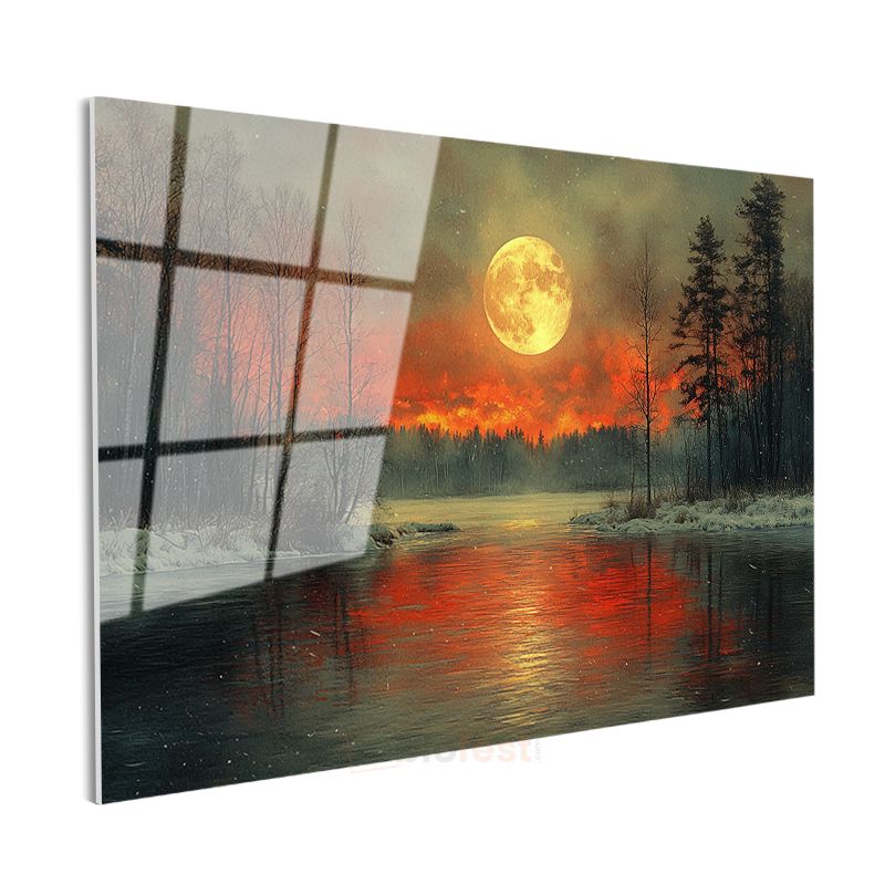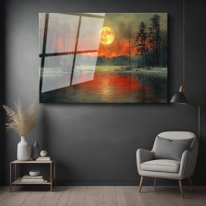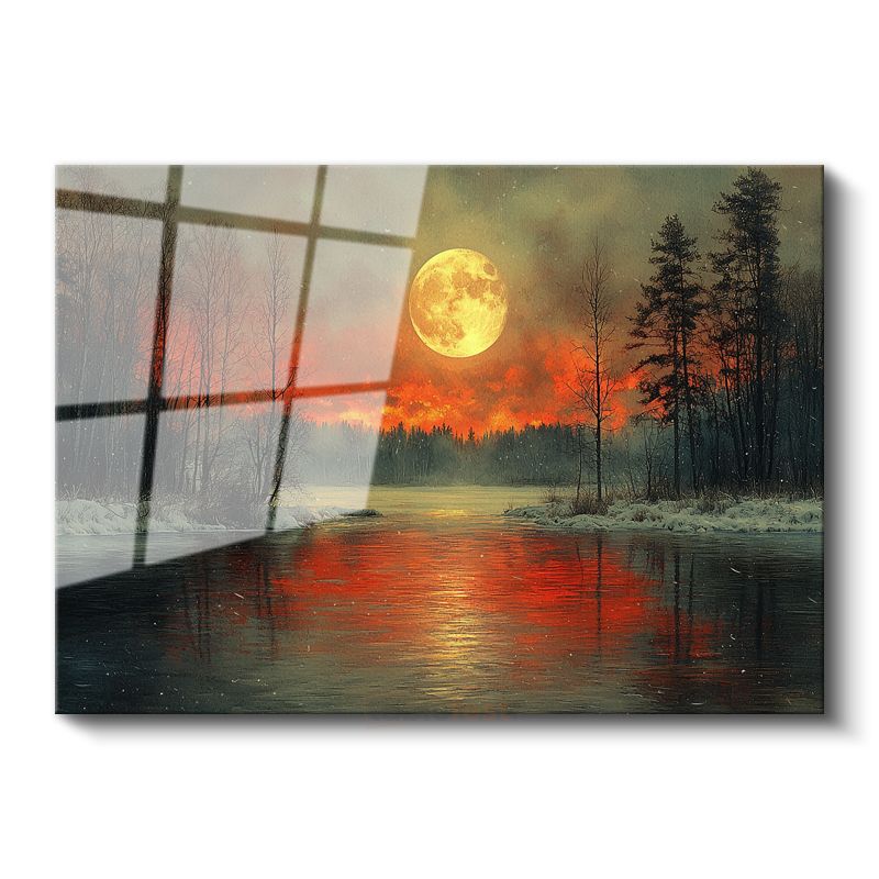 Dolunay Gecesi - Kızıl Gökyüzü Altında Buzlu Göl Manzarası Cam Tablo
