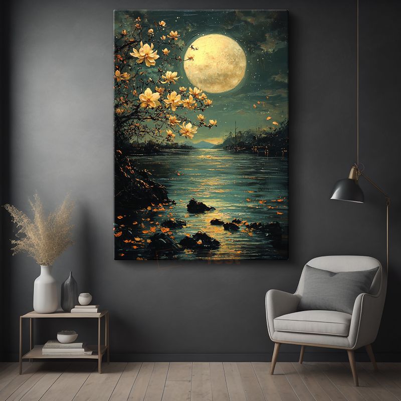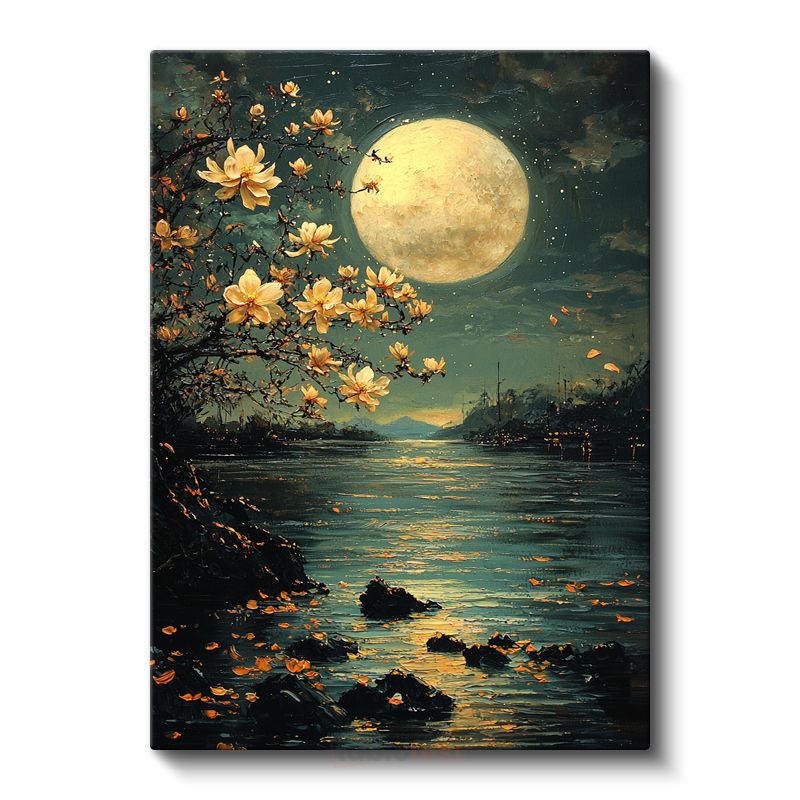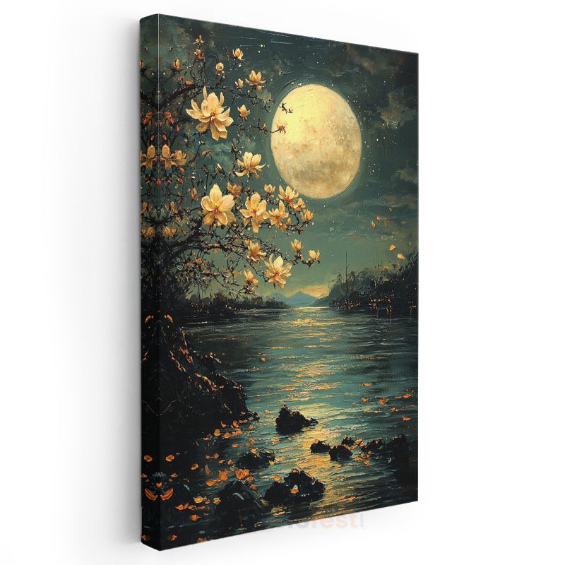 Dolunay Işığı - Altın Çiçekli Ağaç ve Göl Manzarası Kanvas Tablo