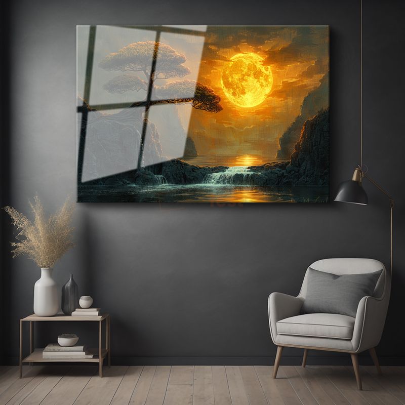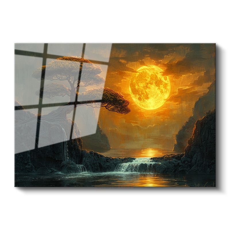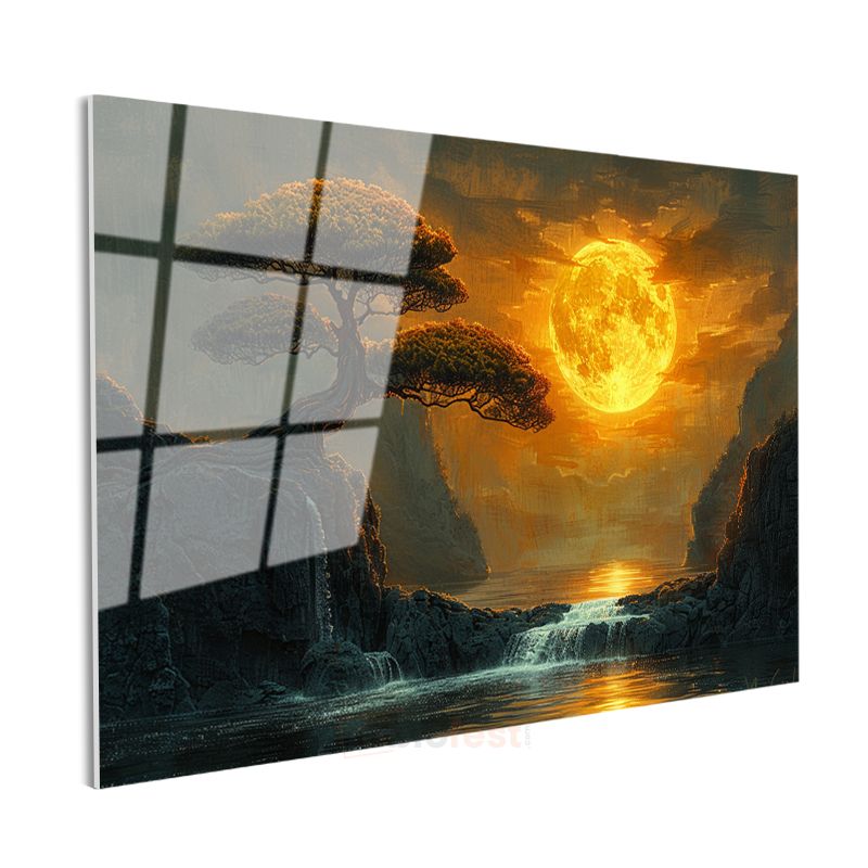 Dolunay - Kayalıklar Arasında Yalnız Ağaç Cam Tablo