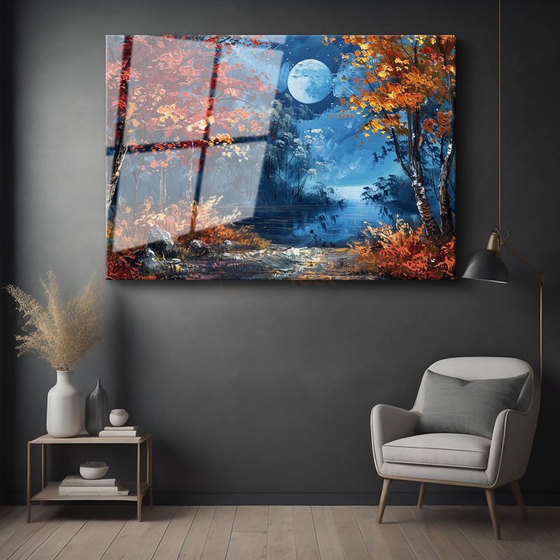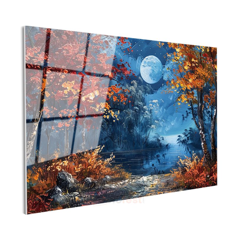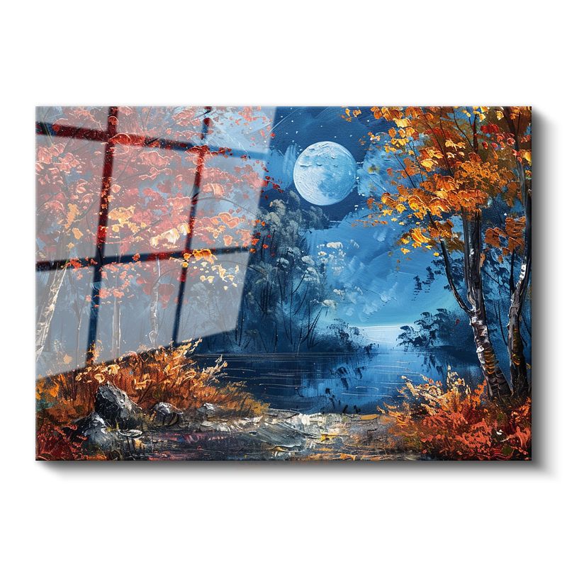 Dolunay Manzarası - Sonbahar Renklerinde Büyüleyici Göl Cam Tablo