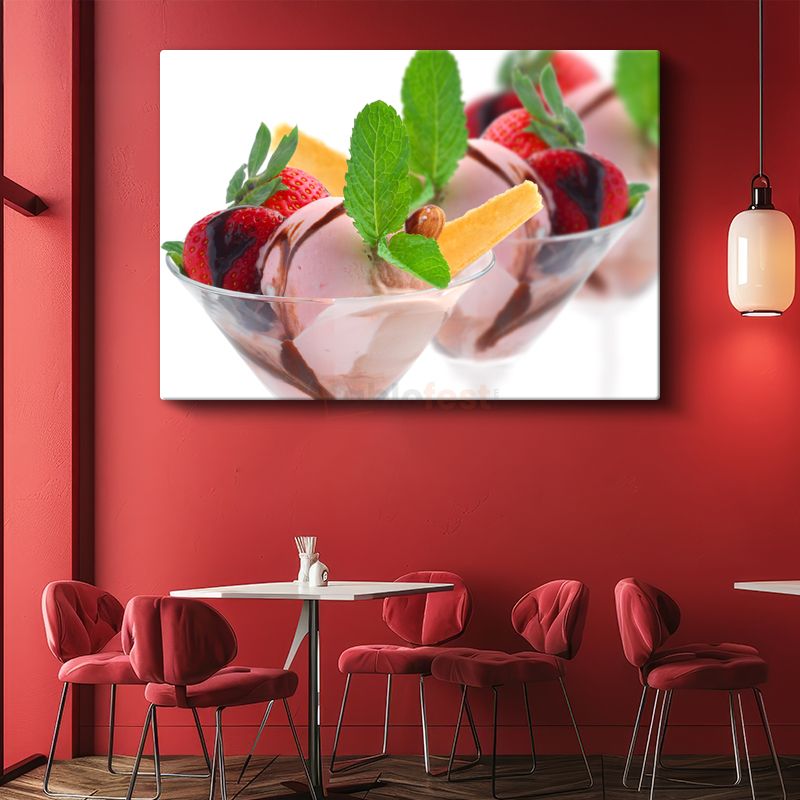 Dondurma Kupları - Çilek ve Nane Yapraklı Tatlı Sunumu Kanvas Tablo