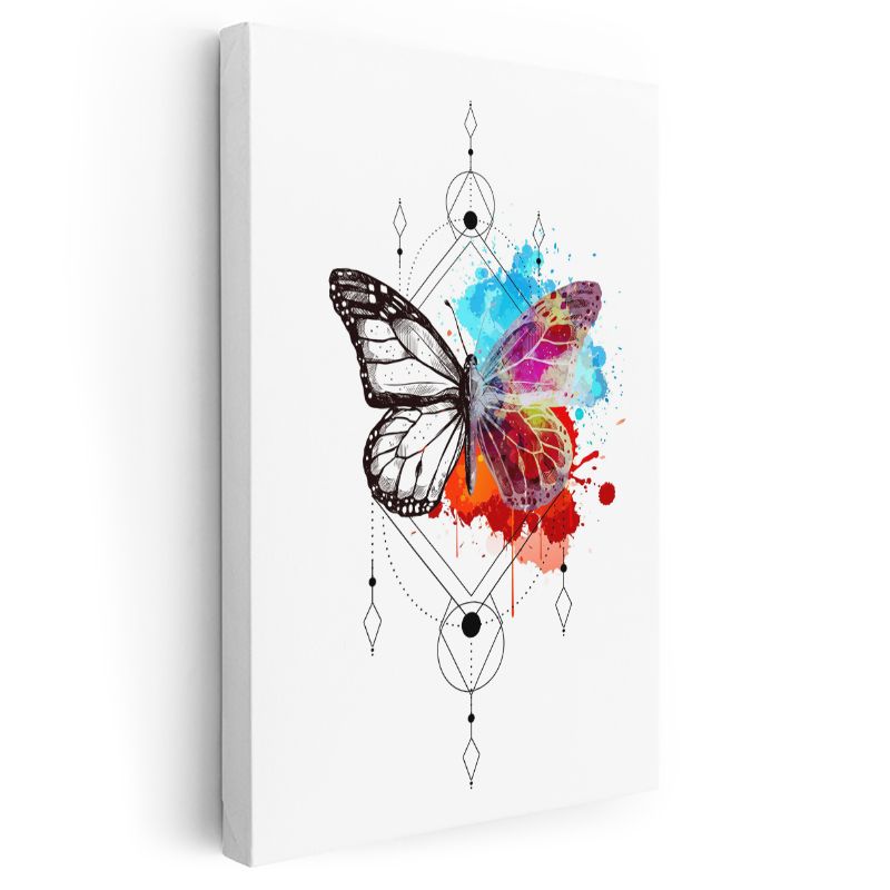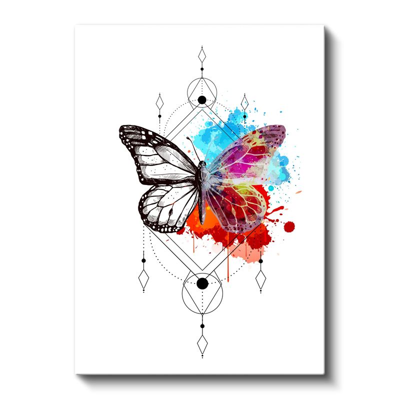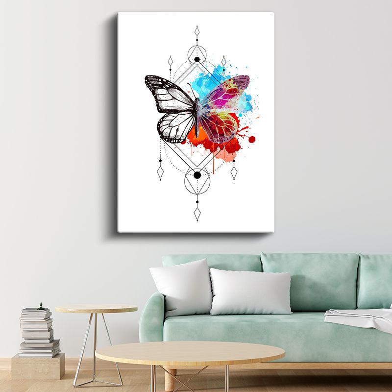 Dönüşüm Kelebeği - Geometrik Çerçeveli Renkli Sıçrama Detaylı Kanvas Tablo