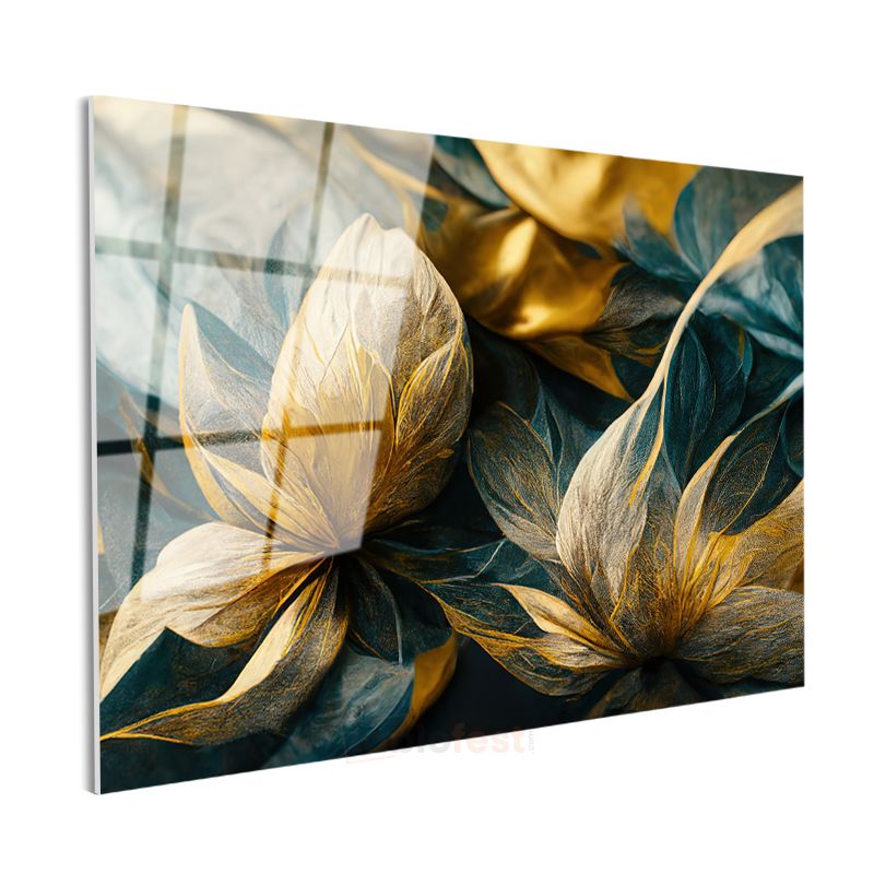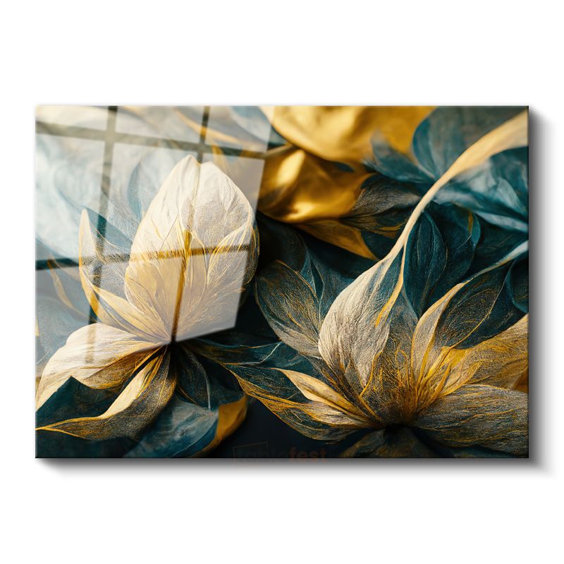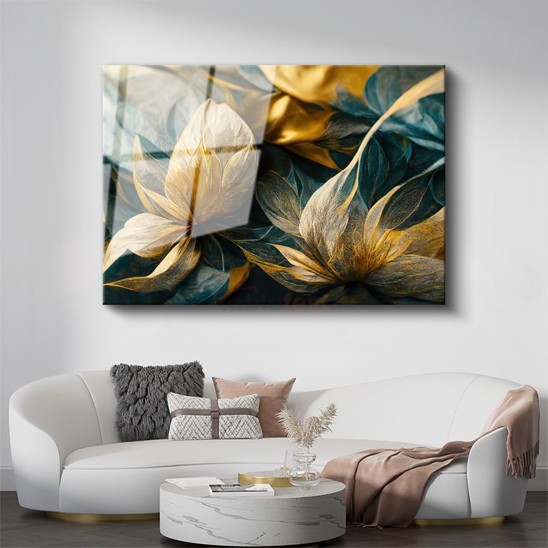 Dumanlı Çiçekler - Turuncu Yapraklı Beyaz Çiçek Dalları Cam Tablo