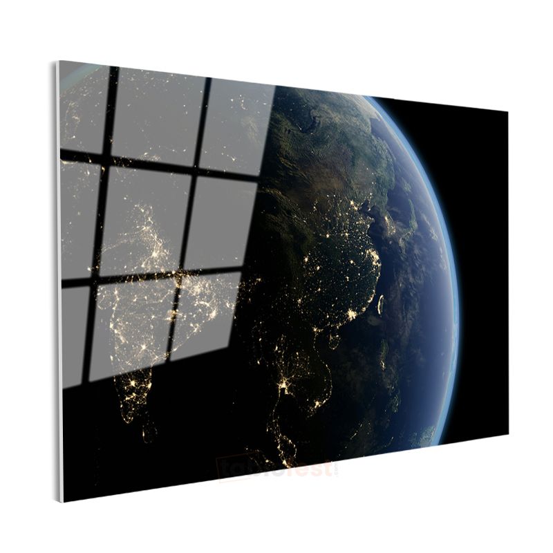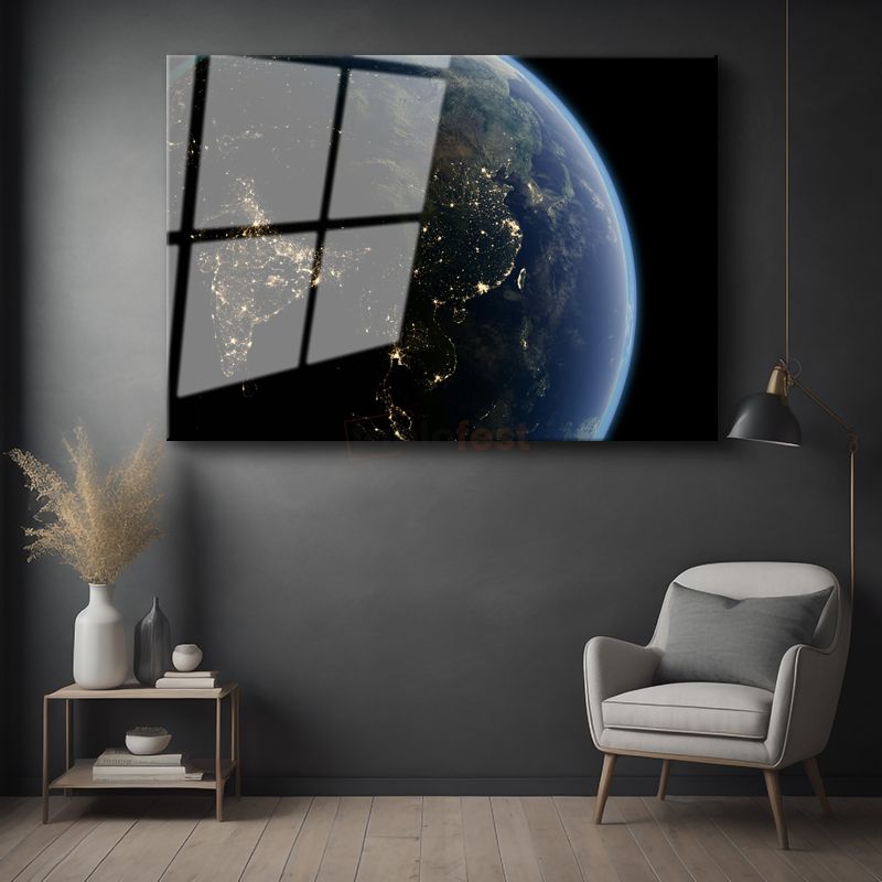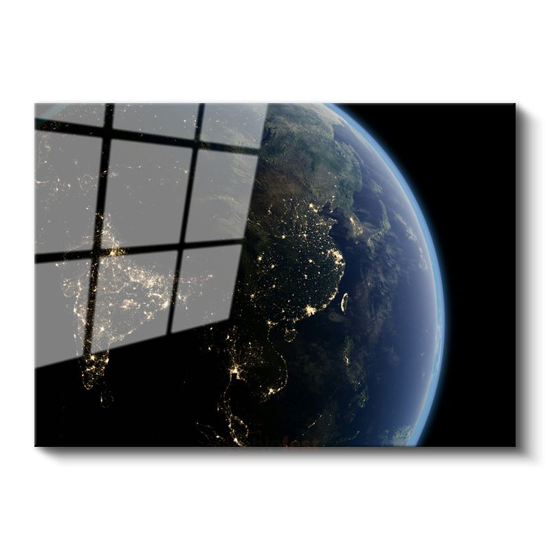 Dünya - Gece Vakti Işıldayan Şehirleriyle Mavi Gezegen Cam Tablo
