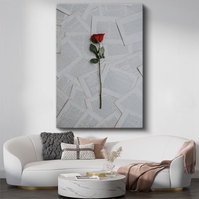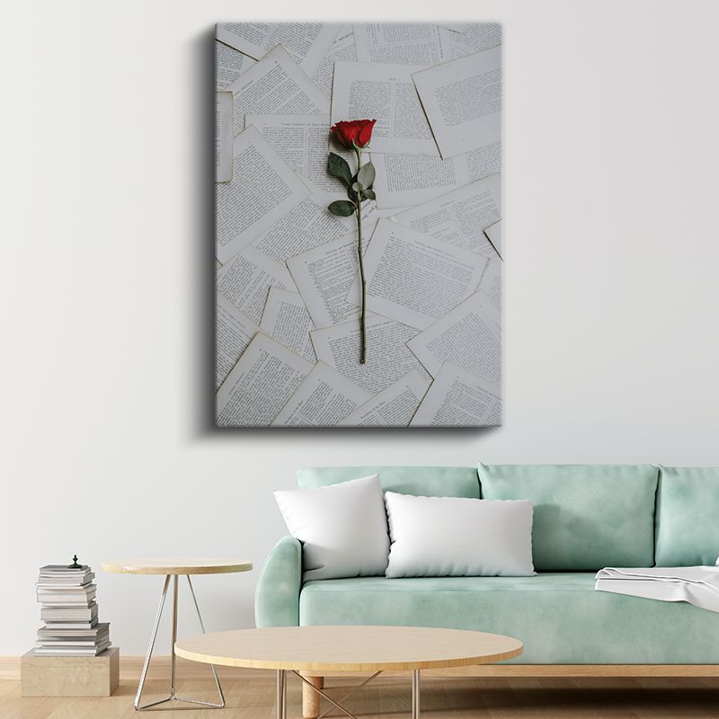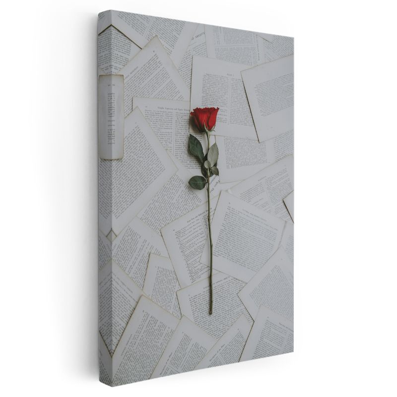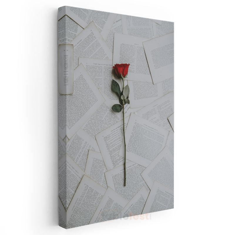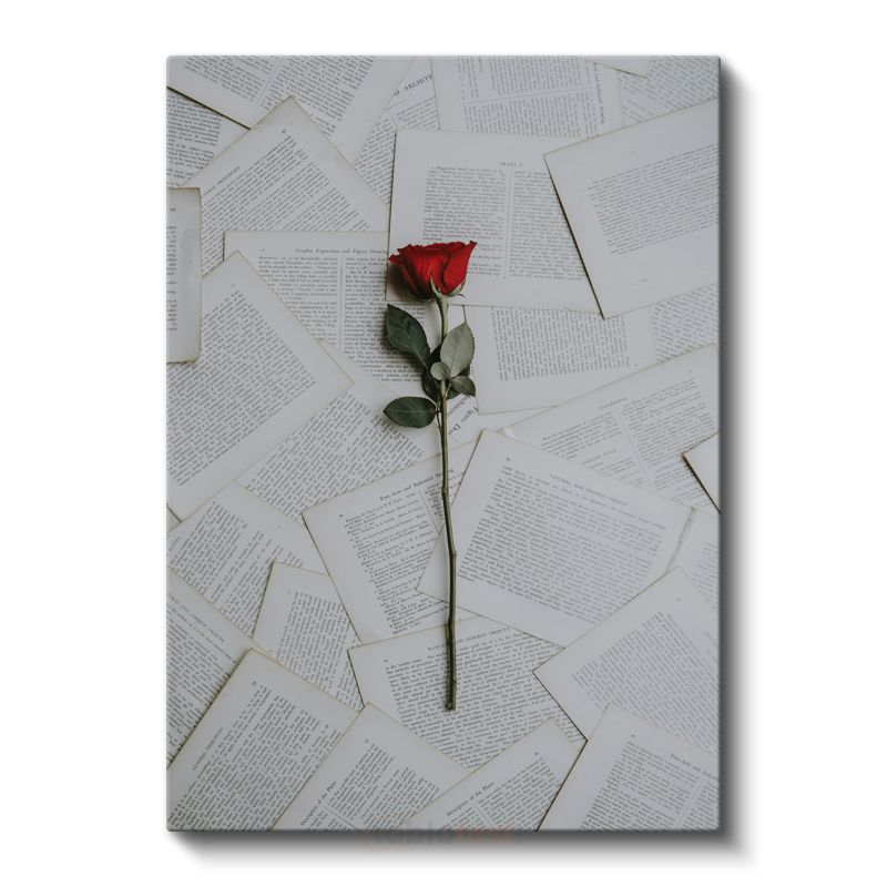 Edebiyat Gülü - Kitap Sayfaları Üzerinde Kırmızı Gül Kanvas Tablo